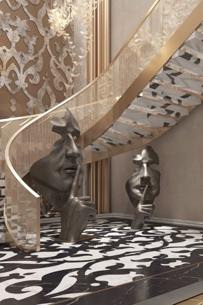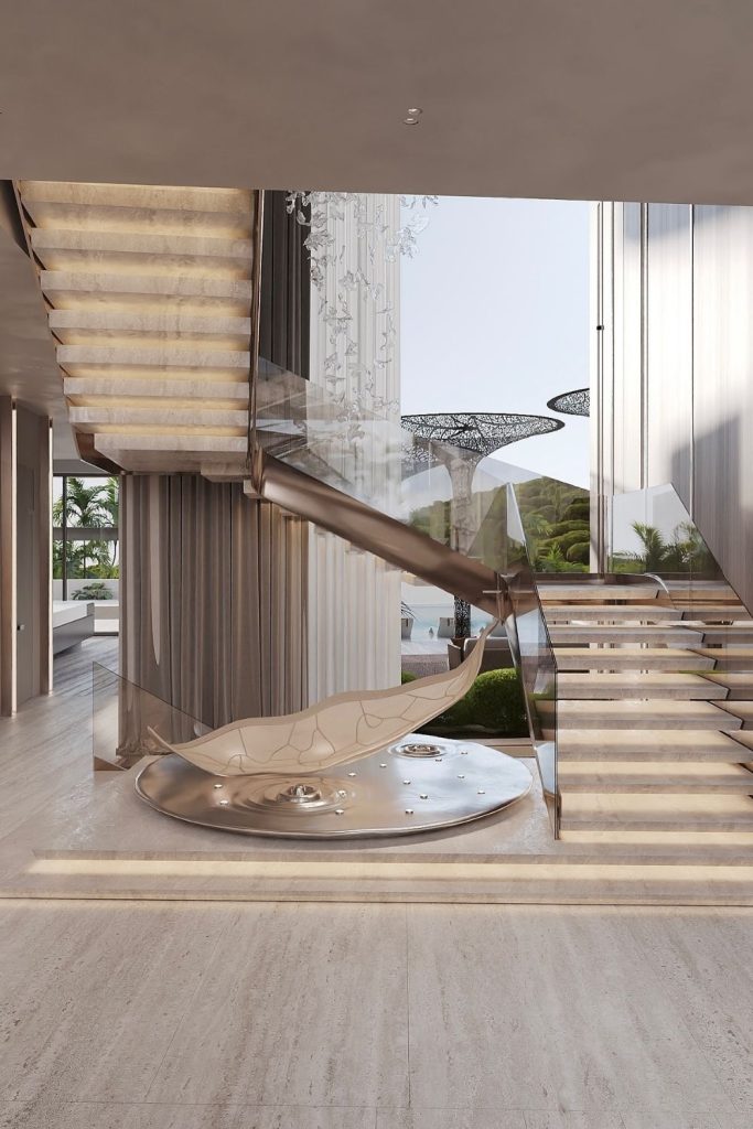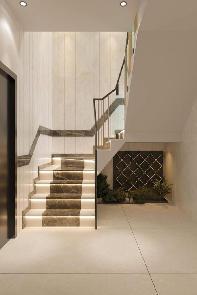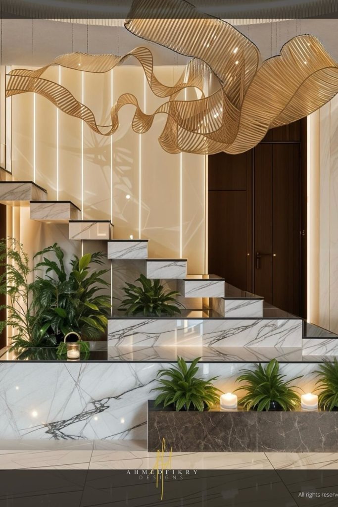 A marble staircase always defines timeless luxury. This design shows white stone steps with soft black lines and golden rails that shine. It mixes classic beauty with modern style, perfect for a cozy fall update. The smooth marble brings a calm glow, while green plants add life and balance. Love decor? You’ll adore this royal vibe. Picture it as the heart of your home. Save this idea and share your dream stair style below.