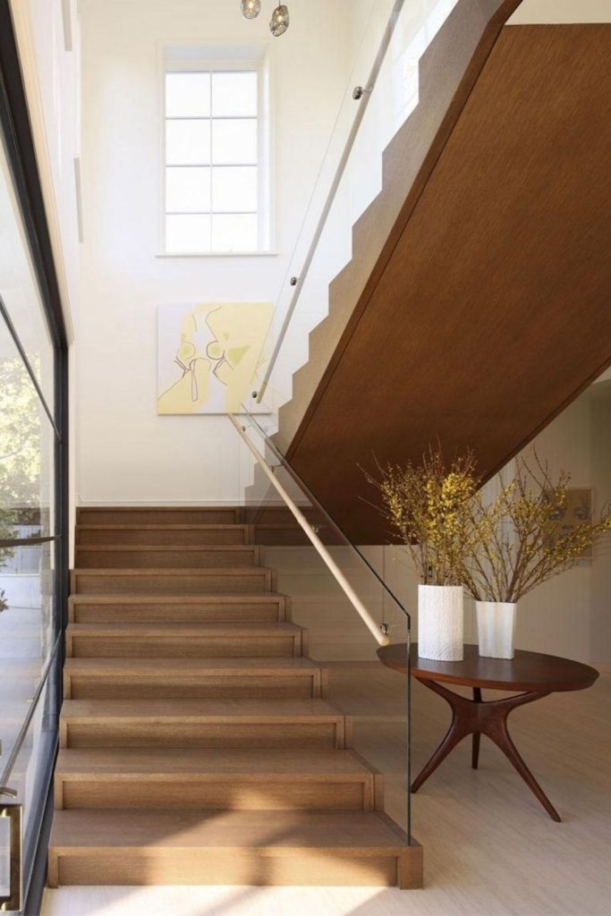 This glass staircase shines with modern elegance. Clear panels replace the traditional railings, letting light fill the space. The warm oak steps add softness and balance to the sleek design, giving the home a cozy fall feel. Add a navy runner for a touch of bold color. Love this look? Save it for later and share your staircase ideas below.
