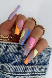 Glitter marble nails look shiny and playful. Mix two soft colors and swirl them for a smooth look. Add glitter for extra glow. I wore this to a party, and it looked so pretty. It fits long nails and gives an easy, classy vibe. Add a clear coat to keep the polish safe.