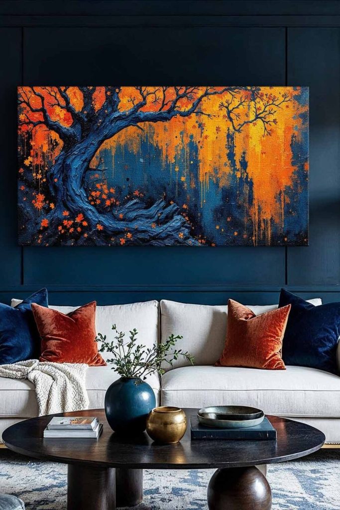Bold rust shapes floating over deep indigo create drama the second you open the door. In an entry, it says “cool people live here” without trying too hard. I love using strong color combinations in small spaces—maximum impact, minimal square footage required.