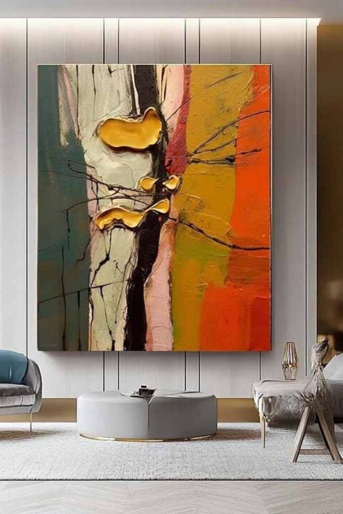 Dirt-tone yellow mixes with rust and burnt red. It looks like fall stays on your wall. The loose, real shapes make the dining spot nice. I used warm art like this in small eating spots. Now, people stay at the table longer. Those sunset hues help people relax.