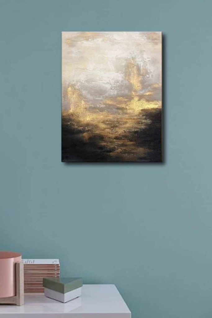 Deep dark blue twists with bright gold lines. The gold catches all the light. Hang this above a dark fabric bed. It feels like you sleep under a storm. Stars shine through it. The feel of the surface is great. You want to touch it. I styled dark art like this in beds. They make the room feel cool and safe at the same time.