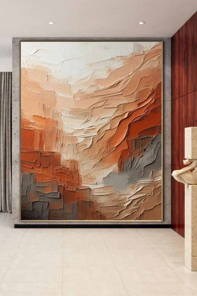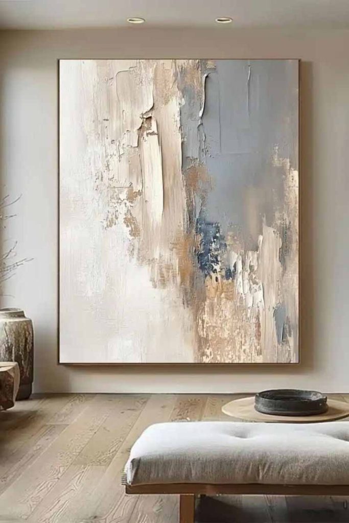 A 70-inch canvas in the creamiest neutrals makes a bedroom feel like a five-star hotel. The subtle horizontal brushstrokes draw your eye across the wall and somehow make the ceiling feel higher. I’ve done this exact move in primary suites and clients always say it’s the best sleep upgrade they never knew they needed.