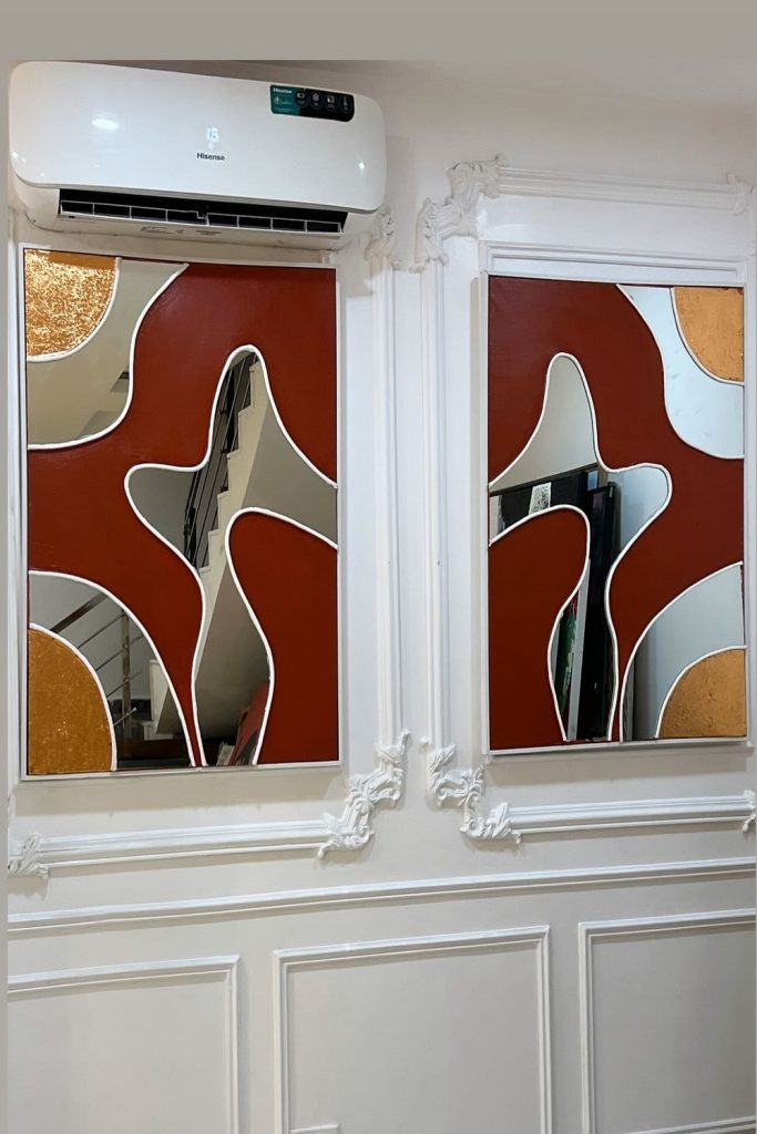 Two tall pieces sit by each other. They form one whole scene. The hues are soft green and warm brown. They also have a hint of pink. The colors look like a sunset. You can live in this sunset. They sit above a smooth stone fire spot. They make the wall the main thing. The room does not feel too full. I love that the soft shapes feel like nature. They still look fresh. This is great for those who love simple ease. They also want a little free spirit.