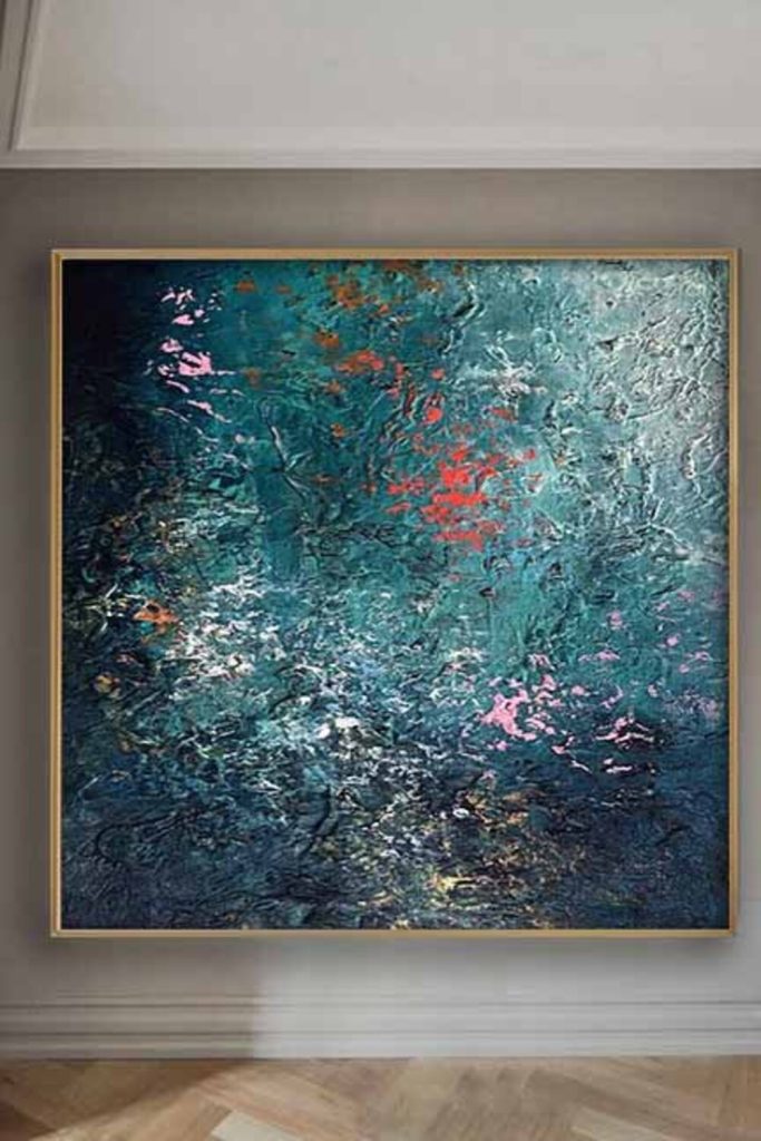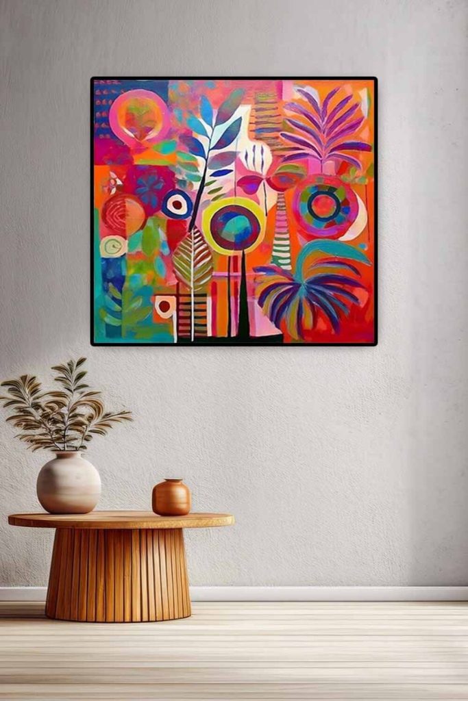 Rich green melts into deep blue. It has spots of bright purple. This art is very fun in a good way. It works well with soft pillows and old rugs. It turns a mixed room into a cool sight. I always say: if your room feels safe, add bright art. It gives instant style.