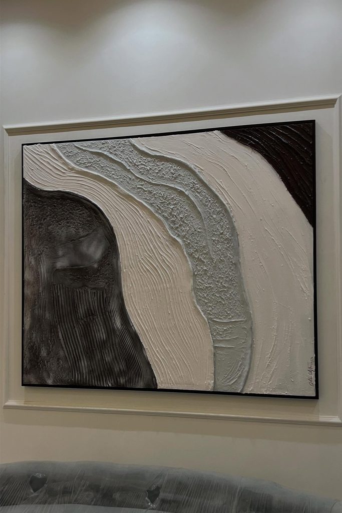 Many dark and light shades of gray, but nice. Thick layers of art give depth. The look changes with the light. In an office, it feels sharp but fresh. I hung a piece like this in my own work spot. Now video calls look cool on goal, not by chance.