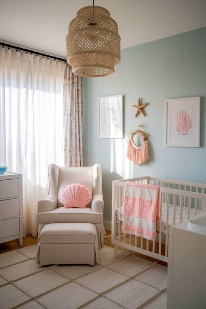 This nursery feels like a breezy seaside escape! Crisp white walls and soft blue accents create an airy vibe, with a sustainable rattan crib stealing the show. A woven rug and nautical mobile add coastal charm. For a bright baby bedroom, use light colors and natural textures. Pro tip: Add sheer curtains for a dreamy glow. This look is fresh and calming! Love coastal style? Save this to your nursery board and share your favorite way to bring beachy vibes to a baby room!