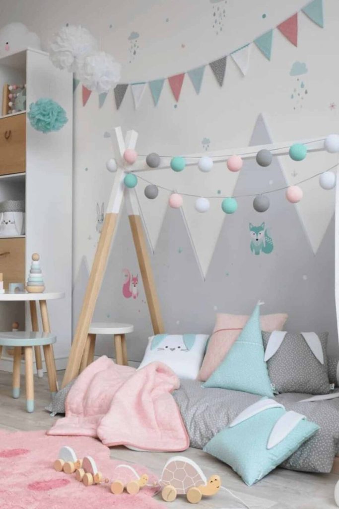 This room feels like a dream! Light pink is on the walls. Mint is on the walls too. A soft rug is on the floor. Felt stars hang up. Baby will love them. Linen curtains hang. A knit blanket sits. It feels warm. Mix light colors. Mix plain colors. Pick cloth you can wash. It is fun! What light colors do you love?
