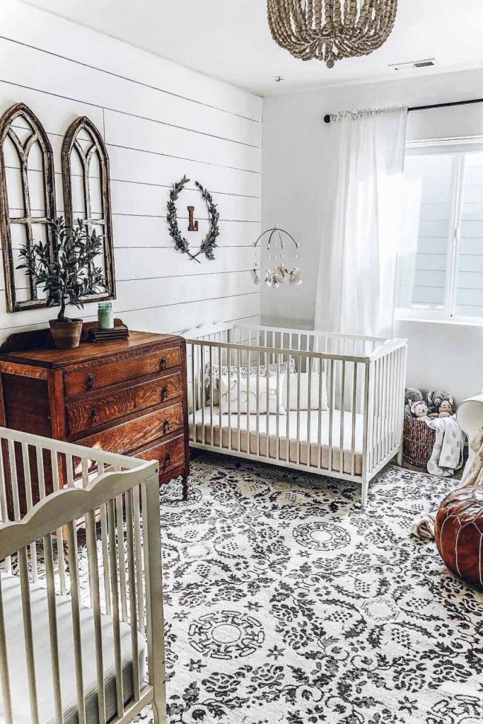 This room is cute farmhouse! White wood is on the walls. An oak crib looks strong. Gray linen sheets feel soft. A woven blanket adds cozy. A wood sign says sweet words. Mix wood. Mix clean lines. Hang a rail for clothes. It looks cute. It helps! Do you love farmhouse? Tell me your rustic idea!