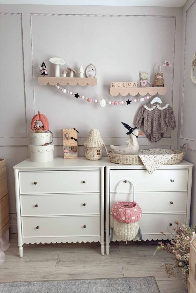 This nursery exudes quiet luxury! Soft gold accents, from a delicate mobile to a metallic lamp, elevate a creamy white palette. The plush velvet rocker and organic cotton crib bedding add cozy sophistication. It’s perfect for a chic baby bedroom refresh. For an elegant nursery, mix metallics with soft textures for balance. Pro tip: Use dimmable lights for a soothing ambiance. This look is timeless and dreamy! Love it? Save it to your nursery inspo board and tell me how you’d add a touch of elegance to your baby’s room!