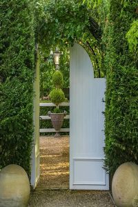 You can never go wrong with this. The white gate is always in style. It makes a clean frame for your yard. It looks good in all weeks of the year. To make it look even better, add green shrubs. Mixing the white gate with bushes is a pro move. It makes your home look neat.