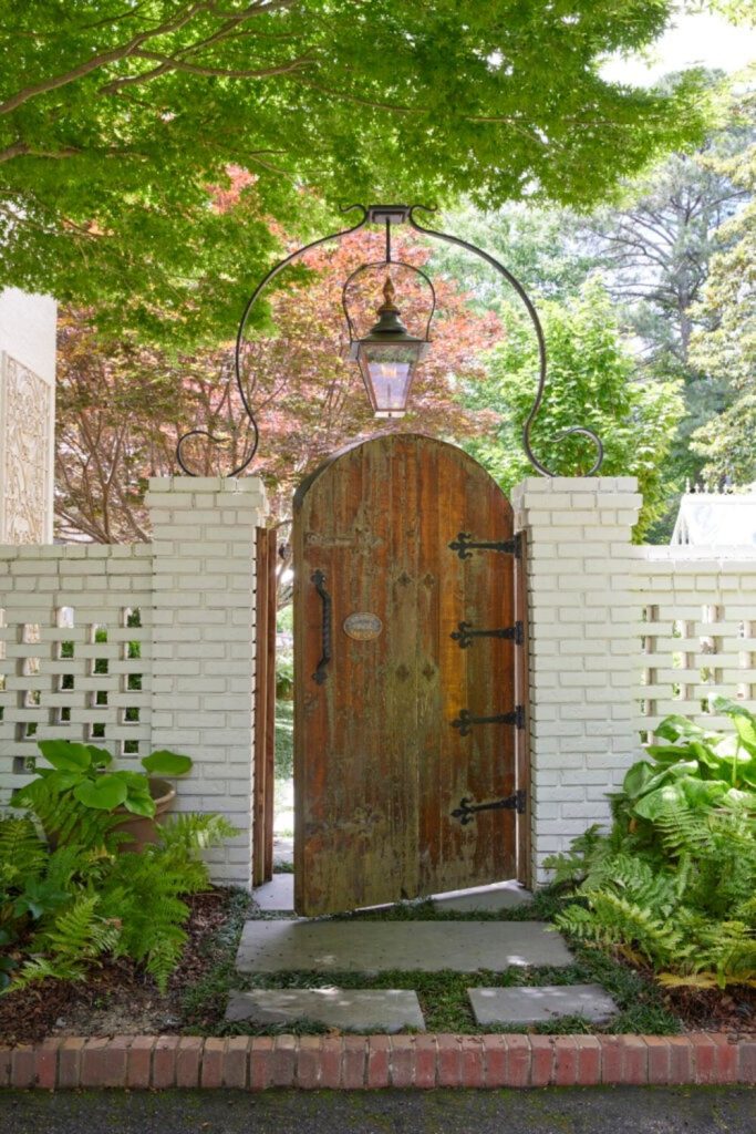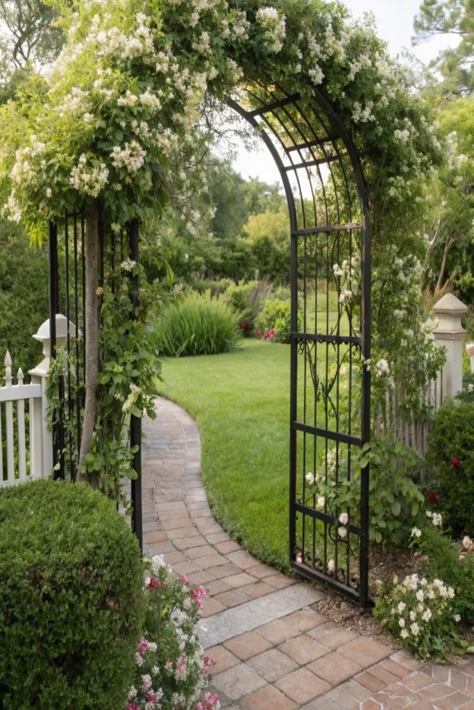 Lighting is the “secret sauce” of garden entrance decor. This classic iron gate is elevated by the addition of oversized vintage-style lanterns. Itβs not just about aesthetics; itβs about safety and “warmth” during the evening hours. When selecting lighting, I always tell my readers to go for warm-toned LED bulbs (around 2700K) to keep the atmosphere inviting rather than clinical. This look is timeless and provides a sense of security and elegance to the homeβs exterior.