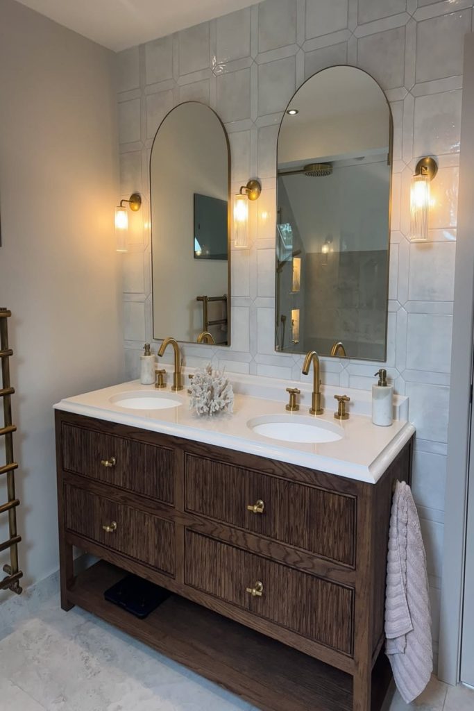 Who says you can only have one mirror in a bathroom? Placing a decorative, non-functional mirror (like a sunburst or a vintage hand-mirror) above the towel bar is a brilliant way to bounce light around. This style is quite “glam” and works well with polished chrome or nickel fixtures. It adds a bit of sparkle and makes the wall feel “dressed up.” I personally love this in small powder rooms where you want to create a “jewel box” effect for your guests.