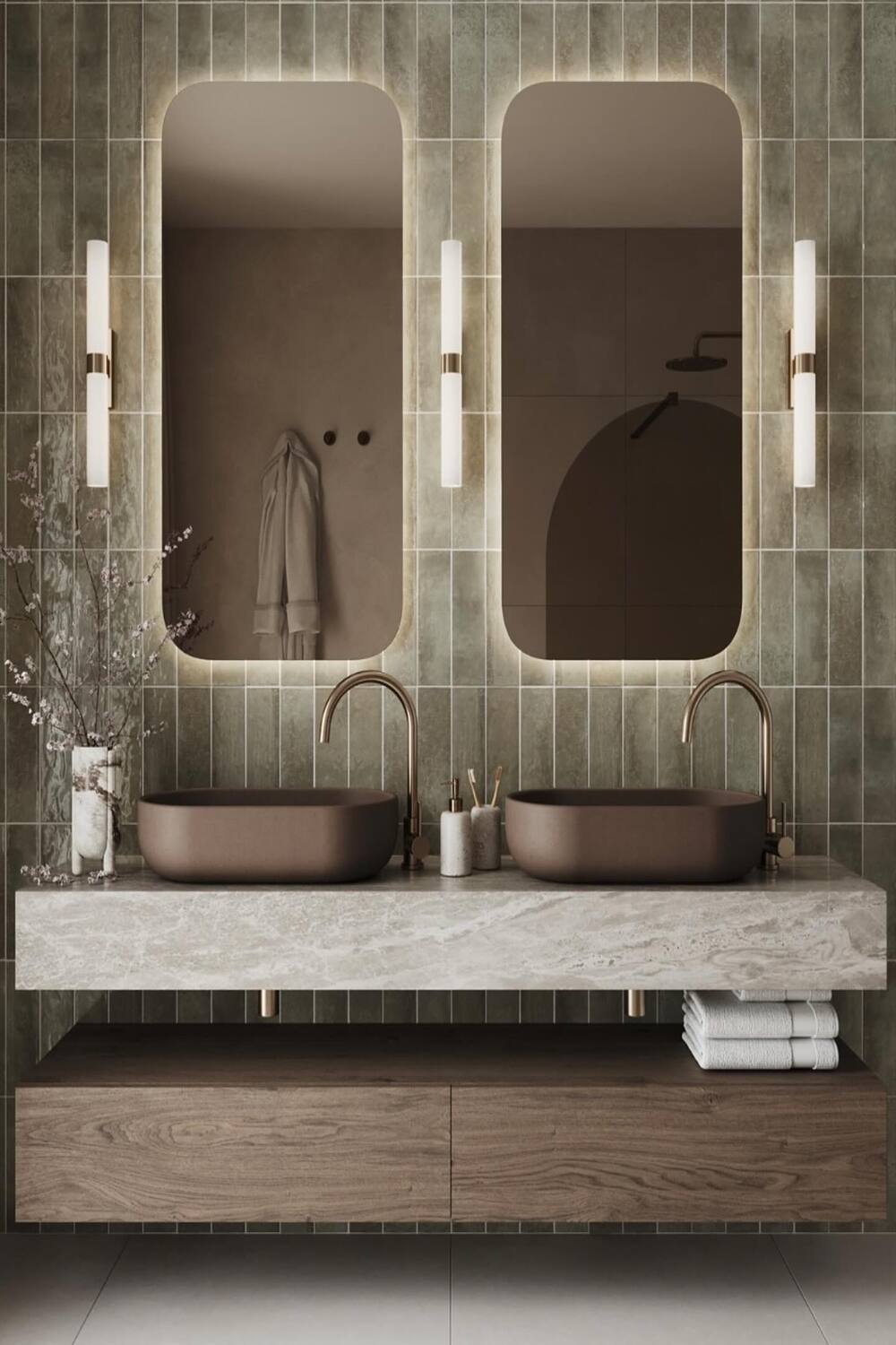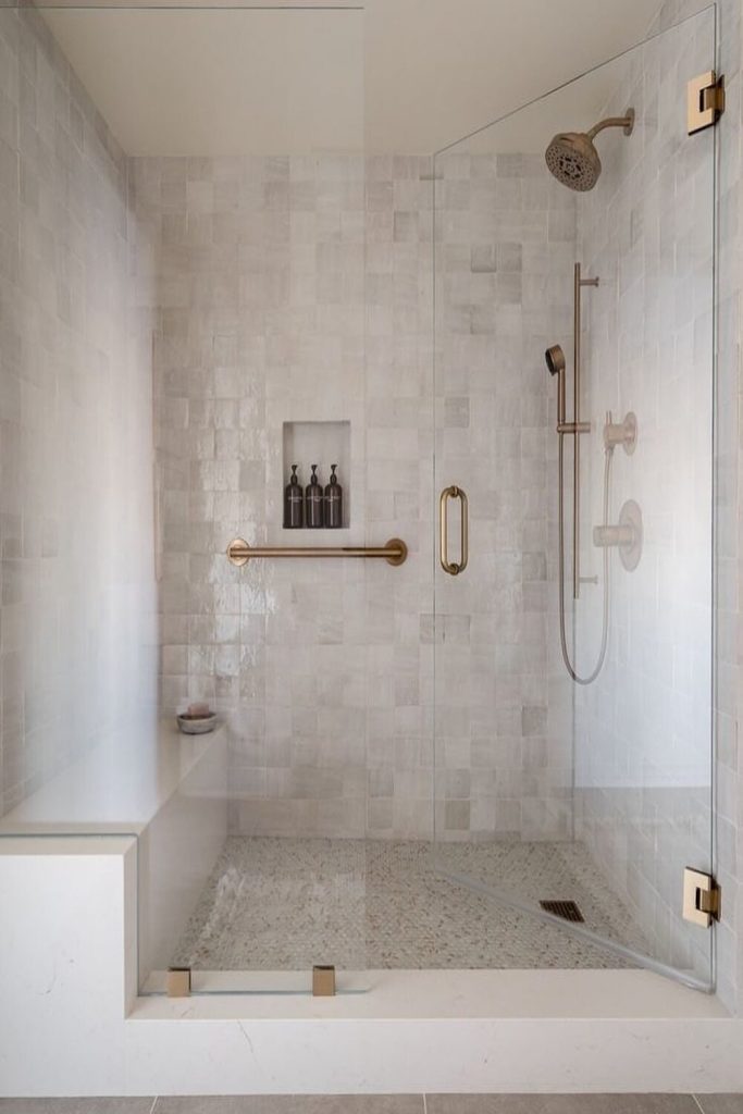 Marble isn’t just for countertops! This look incorporates marble-backed shelving above the towel bar for a truly decadent feel. When you’re working with such a premium material, you don’t need much else. A few gold-capped jars or a high-end perfume bottle on the shelf is plenty. I always suggest this for primary suites where you want that “five-star hotel” experience every morning. The reflection of light off the stone makes even small bathrooms feel much larger and brighter. It’s an investment in style that pays off in daily joy.