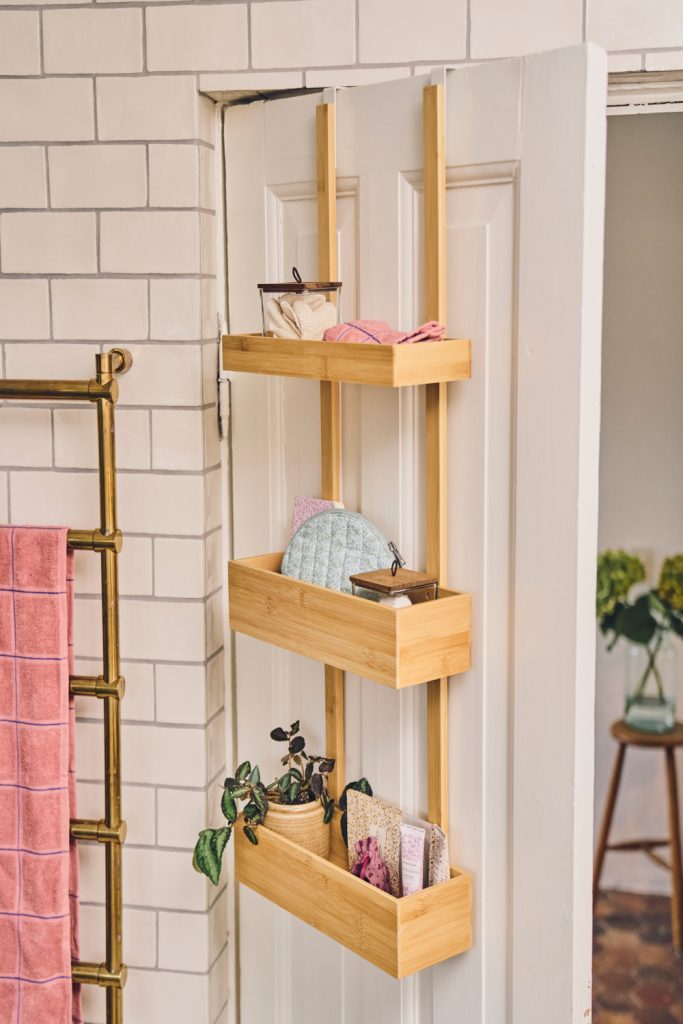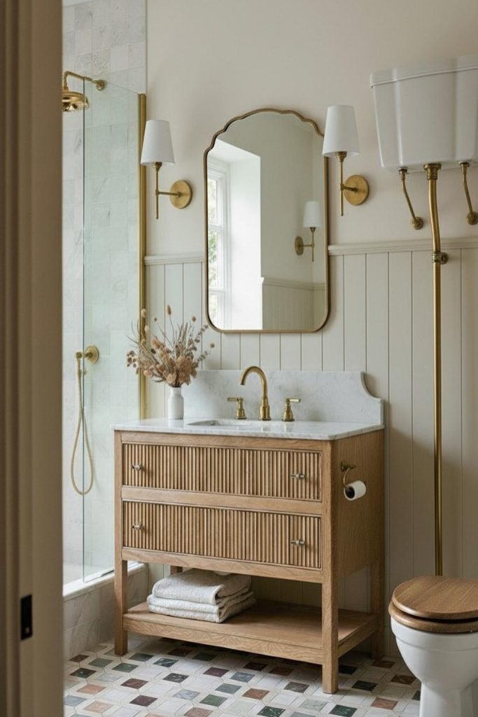 It feels good to mix wood and white. This look is very calm. Put a wood shelf above the bar. It can hold your soap and small jars. Use one tall vase and one short jar. This keeps the look fun and not messy. It adds style but keeps the room clean and light.