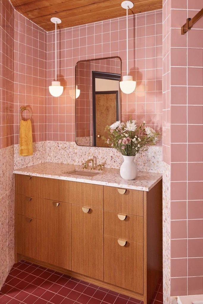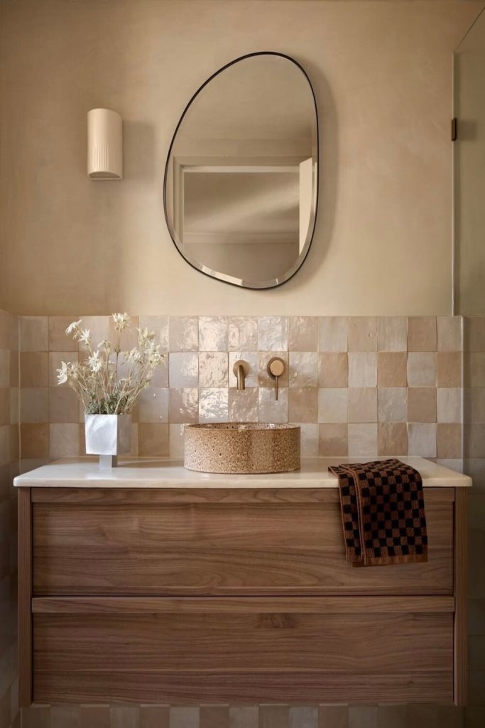 If your bathroom feels a bit “blah,” a big piece of abstract art above the towel bar is the easiest fix. This style uses bold colors—like terracotta, mustard, or navy—to inject some personality into a standard white bathroom. I love how one single piece of art can dictate the whole color story of the room. You can then pull colors from the art for your hand towels and bath mats. It’s an affordable way to stay “on trend” because you can swap the art out whenever you want a new vibe!