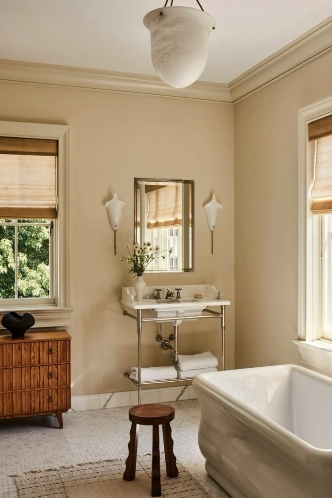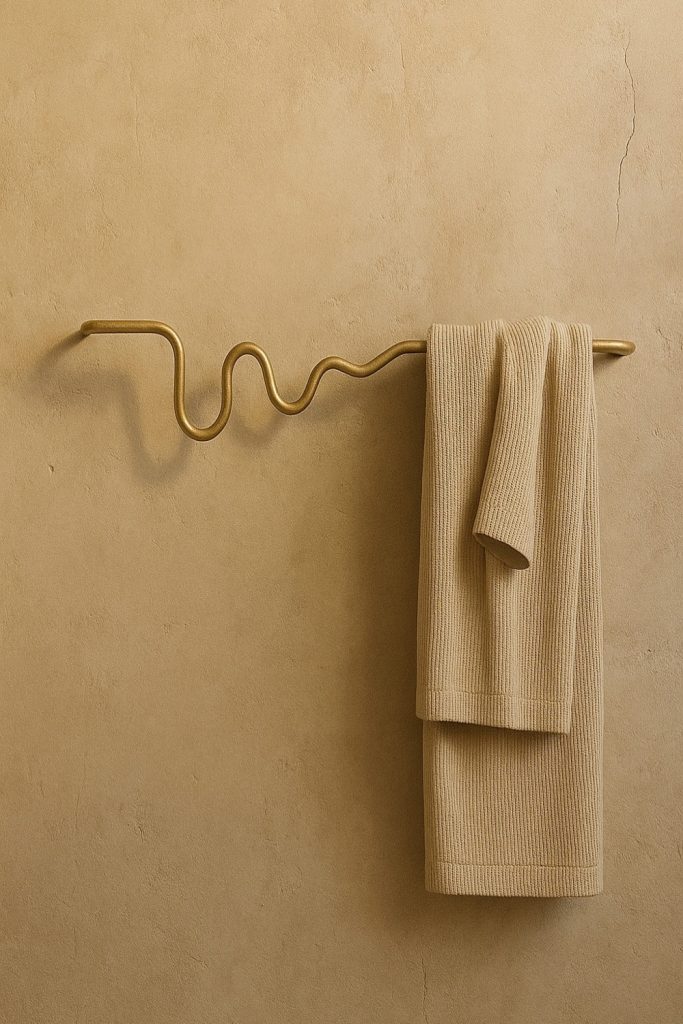 This style leans into natural light and warm wood tones. Above the towel bar, a simple wooden peg rail offers extra hanging space while looking like a deliberate design choice. I’m a huge fan of “functional decor”—items that look good but also work hard. Hanging a dried flower bunch or a loofah alongside your towels makes the space feel lived-in and charming. It’s perfect for a guest bath where you want visitors to feel instantly at home and comfortable.