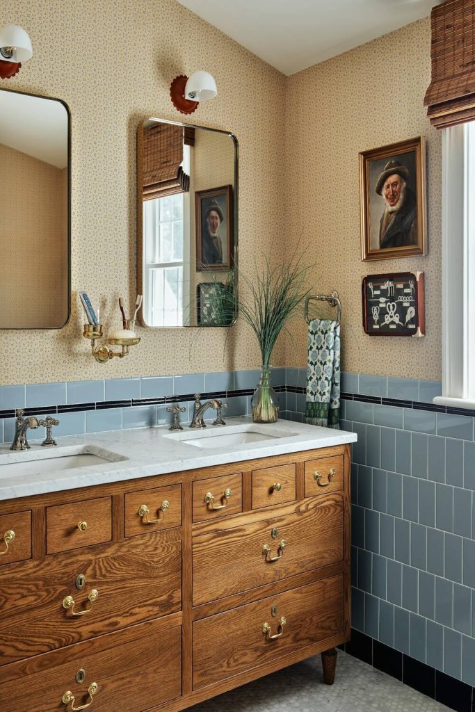 This is for the book lovers and history buffs. Think framed vintage anatomy sketches or old-world maps placed above a heavy dark wood towel rack. It’s a very scholarly, cozy look that feels incredibly unique. I love seeing people bring “living room” energy into the bathroom. Using a small battery-operated picture light above the art adds that extra layer of sophistication. It’s a bit unconventional, but that’s exactly why it works—it tells a story and makes the room feel like a destination.