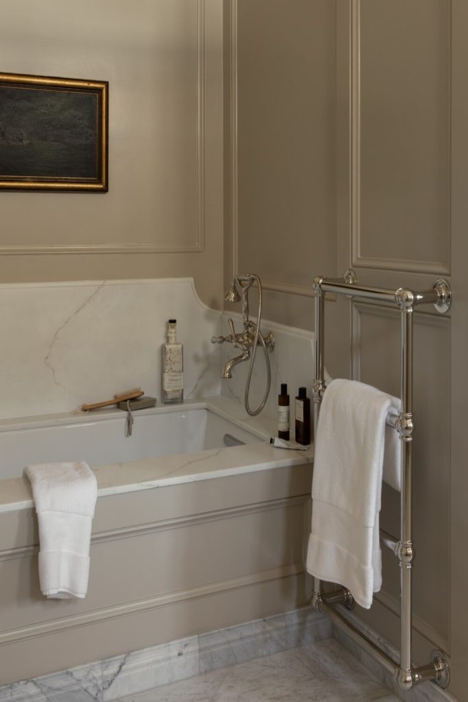 This shows the power of classic millwork. When you have beautiful wainscoting, the towel bar becomes part of the architecture. Decorating above it usually involves a more formal approach—perhaps a set of two or three matching sketches in high-quality frames. This is “grown-up” decor at its best. It feels established and sturdy. If you have the space, a small wall-mounted candle sconce next to the art adds a lovely glow for evening baths. It’s all about those small, thoughtful details.
