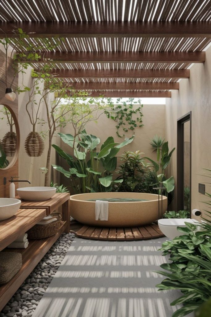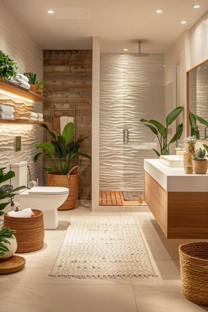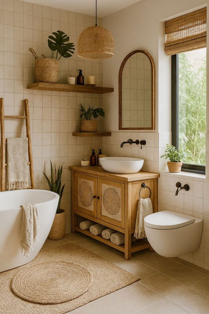 This boho-inspired bathroom feels like a warm hug. The earthy terracotta tiles and woven rug scream cozy minimalism, while the wooden shelf with greenery adds soul. I’m obsessed with the soft lighting that enhances the relaxed vibe—perfect for a soothing bath. As a decor enthusiast, I’d add a macramé wall hanging for extra texture. This 2025 trend blends sustainability with style. Want to bring boho to your bathroom remodel? Start with natural materials and soft hues. Share your favorite boho touches below and pin this for your next renovation!