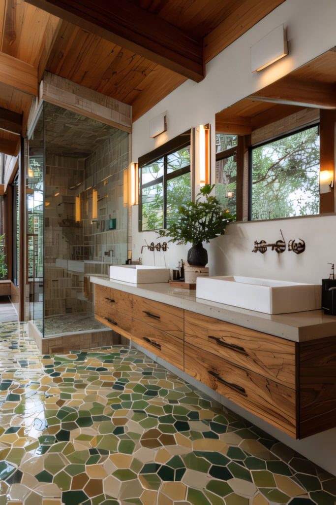 This tropical bathroom remodel feels like a vacation. The lush green tiles and bamboo accents create a vibrant, 2025-inspired oasis. A large plant adds drama. As a decor blogger, I’d suggest a colorful towel to enhance the tropical vibe. This space is perfect for a refreshing escape. Want a tropical bathroom makeover? Pin this and share your favorite bold elements. How do you bring vacation vibes home? Drop your ideas in the comments!