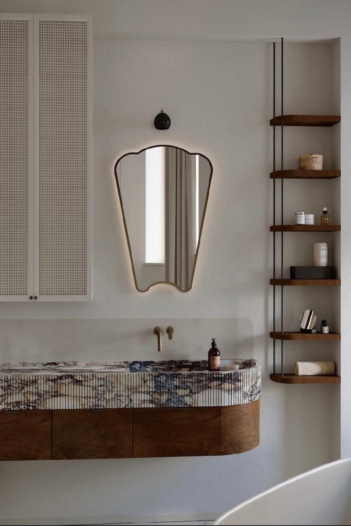 This vanity is great for people who love the earth. The reclaimed wood and simple design look natural and modern. Open shelves hold green bins for a clean, tidy space. The soft colors match 2025’s earthy trend. I’d add a small ceramic jar for a sweet touch. As a fan of eco decor, I love how it looks fresh and kind to nature. Want a green bathroom? Save this look and share your best eco tips below!