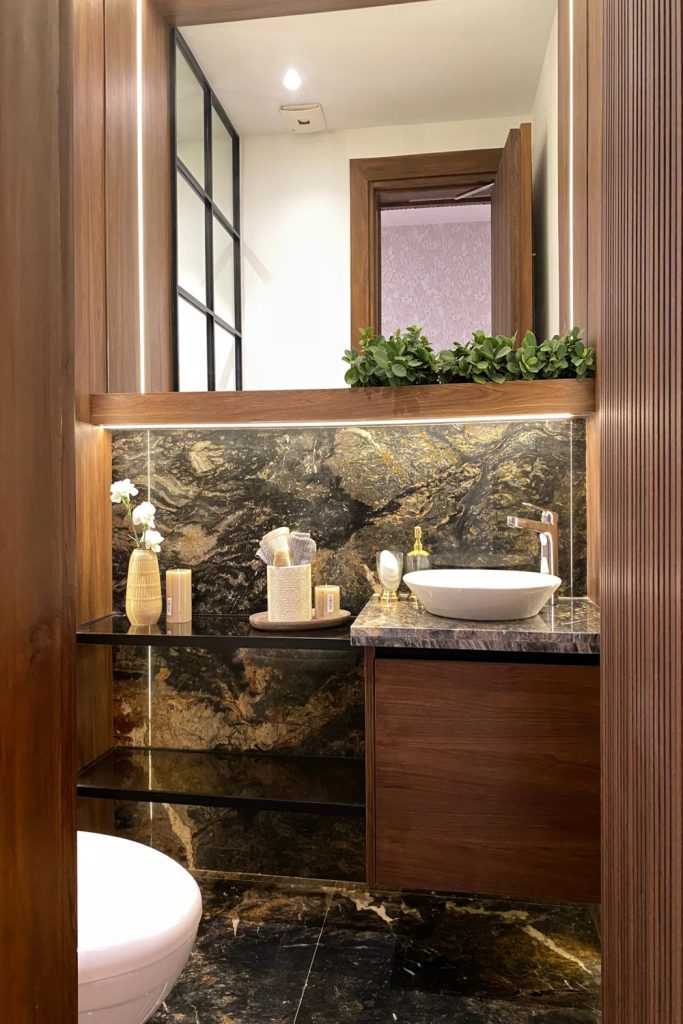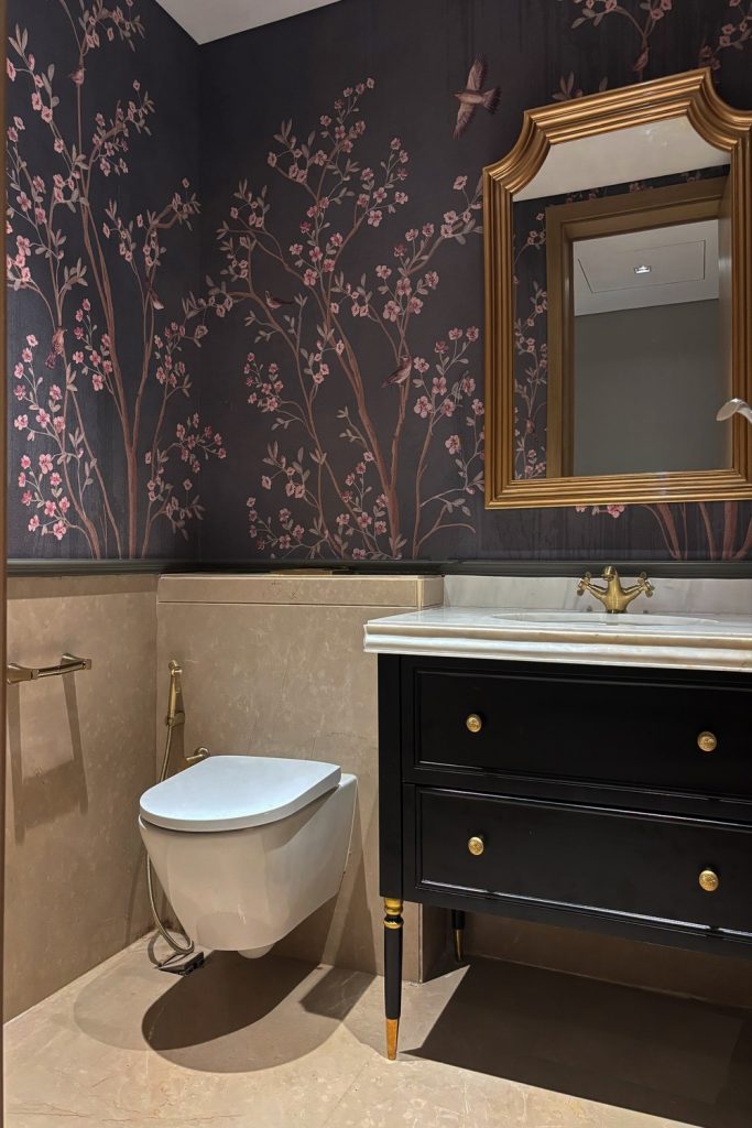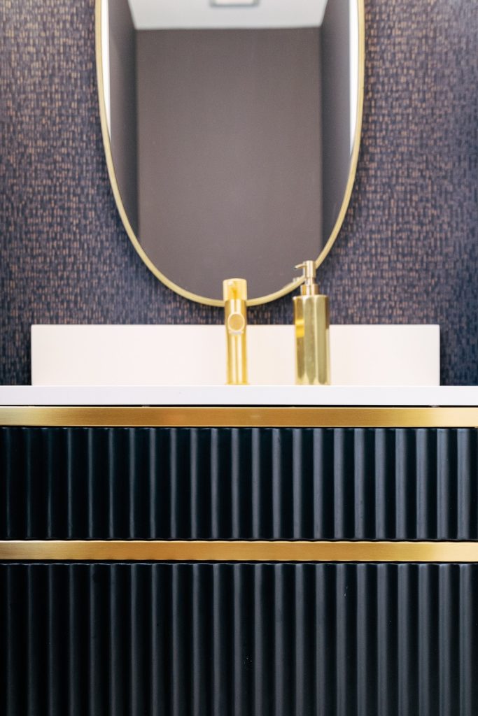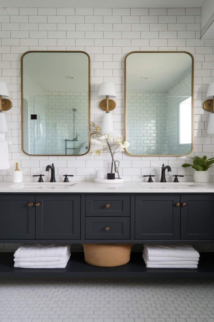 Wow, this vanity really pops! The deep navy tone and gold handles feel bold and rich. It has two sinks and lots of drawers for easy storage. A clean mirror keeps it simple, while a green plant adds life. It’s both stylish and useful. Add metallic trays for a classy touch. Want your bathroom to stand out? Pin this and tell me your favorite bold looks!