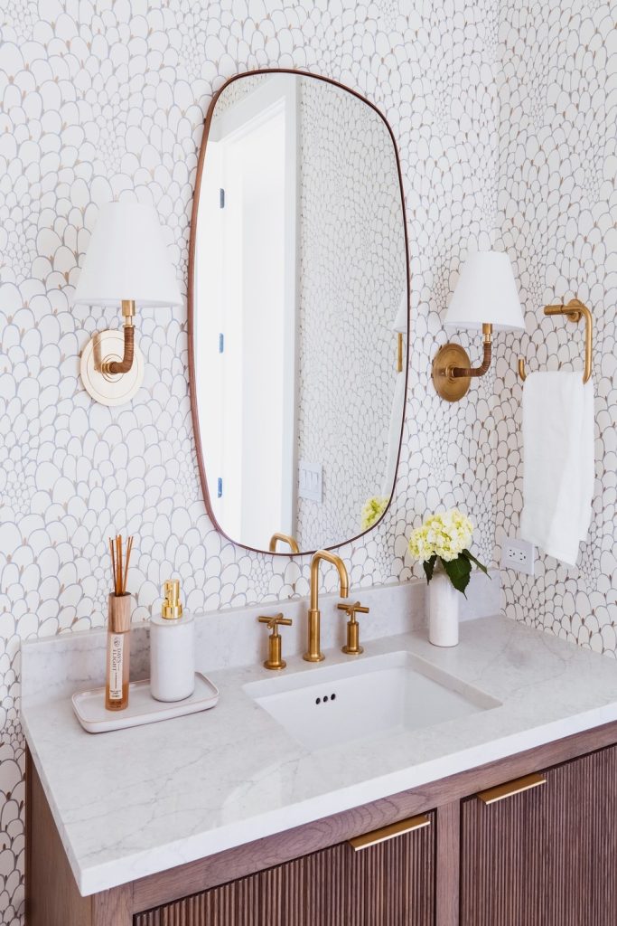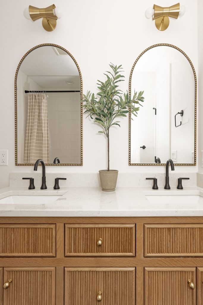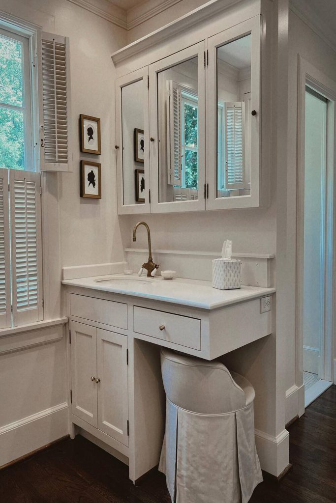 This vanity feels soft and elegant. The gray marble top and brass handles look fancy but calm. Deep drawers help keep things tidy and neat. A round mirror and warm lights make it glow. I’d add ceramic jars for a matching style. This design fits 2025’s love for natural and lasting looks. Want some classic charm? Pin this and share your elegant vanity ideas!