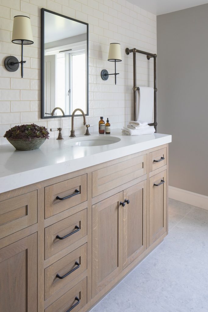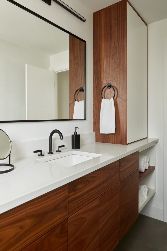 This white vanity feels clean and open. The smooth lines and shelves fit small bathrooms so well. Wicker baskets hold your things and add a soft texture. Green towels bring a fun pop of color. It feels cozy and bright at once. Add a wooden tray for a nice touch. Want a light, breezy bathroom? Pin this and share your storage tricks!