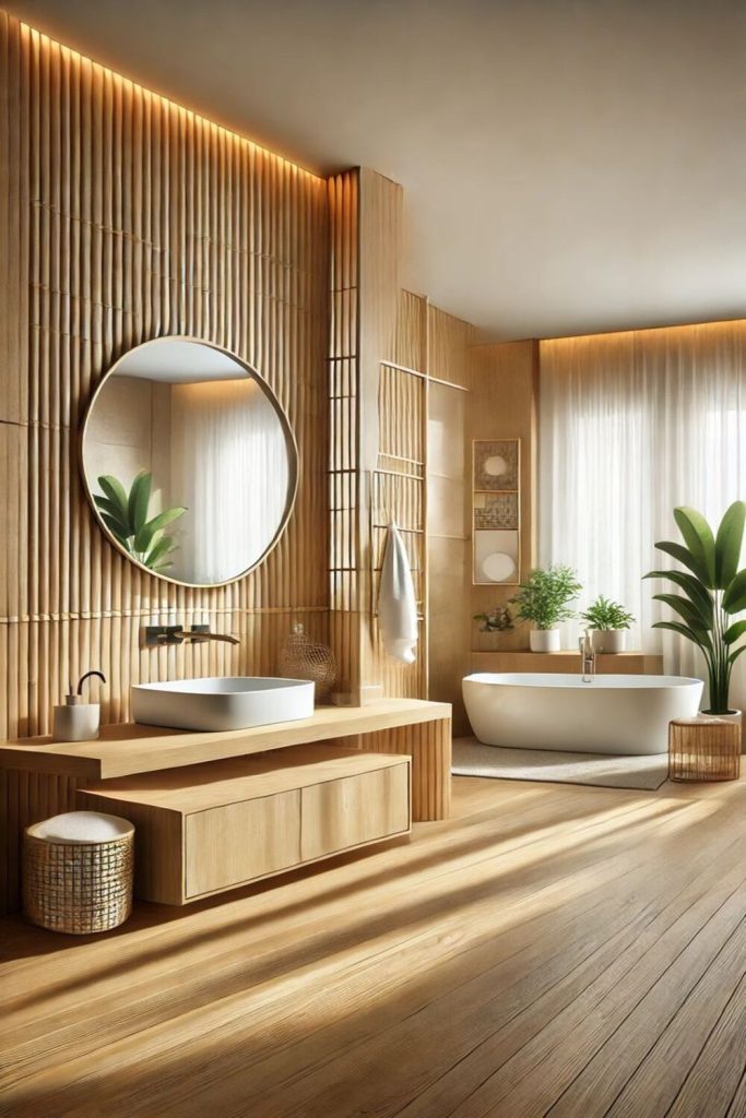 This vanity looks light and simple. The pale wood and open shelves make the space bright and airy. Woven bins add texture and hide bathroom items. The soft beige shades match 2025’s earthy color trend. I’d add a ceramic vase for a sweet touch. It shows that even small bathrooms can shine. Love simple design? Share your ideas and save this one for later!