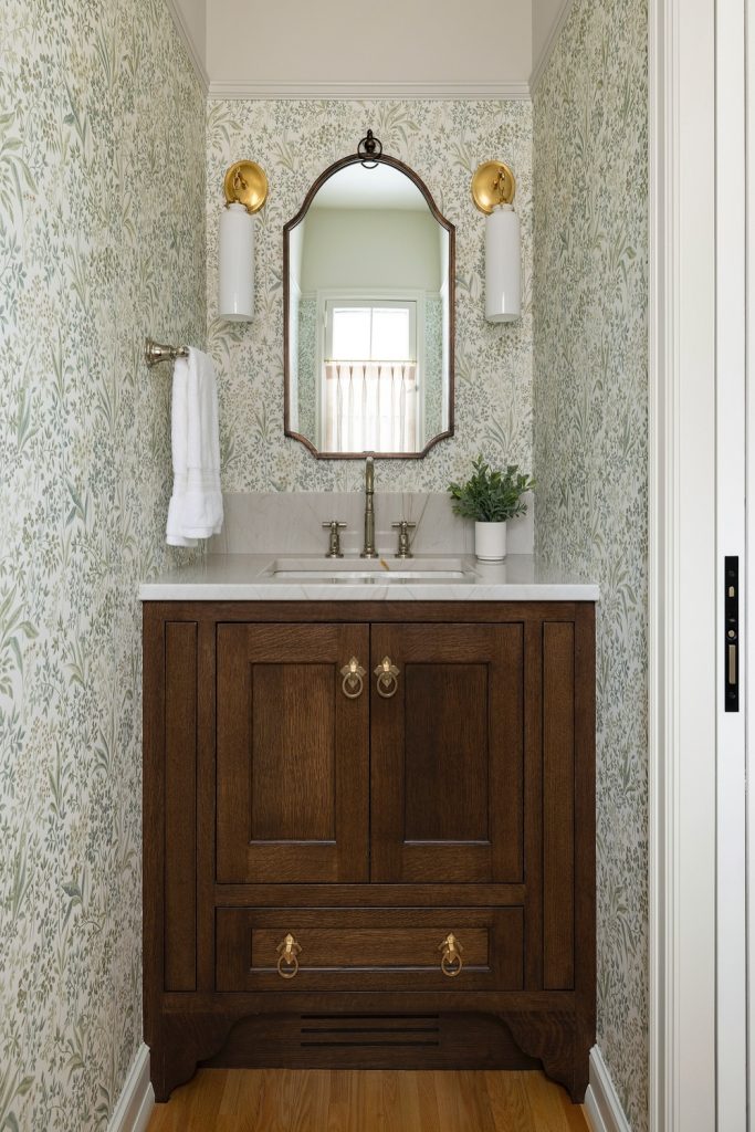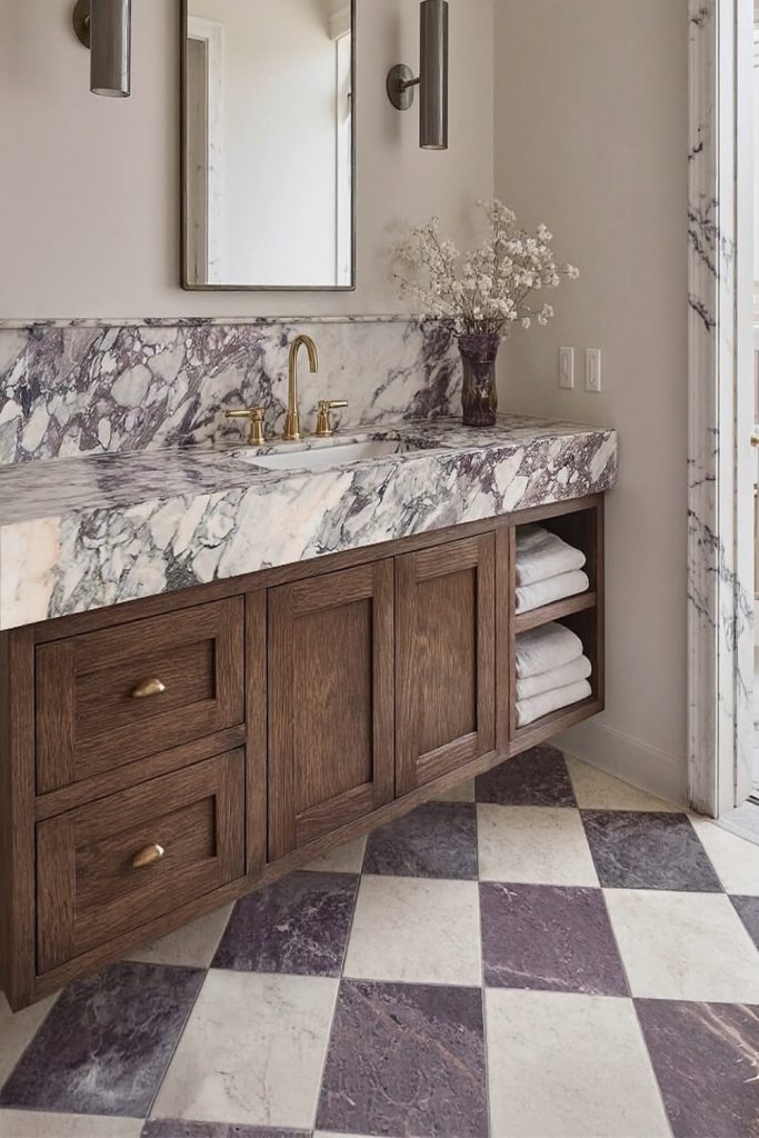 This vanity brings lovely vintage charm. The worn wood and fancy lines feel timeless. The open shelf with baskets keeps things neat and cozy. A warm light and oval mirror add a soft glow. A tiny green plant makes it feel fresh and alive. I love how this design feels like a hidden gem. It’s great for small bathrooms with big style. Want to try vintage decor? Save this and share your ideas below!