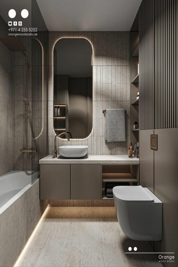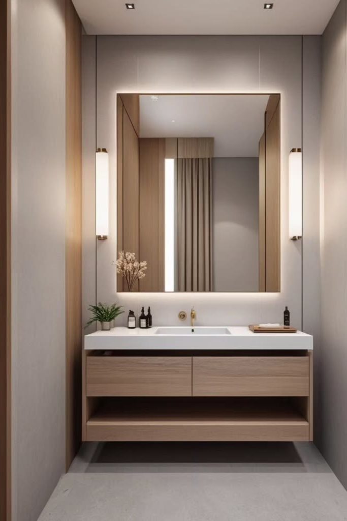 This small vanity is great for tight spaces. The smooth gray finish and smart drawers make it neat and handy. The simple mirror and soft lights keep it open and bright, just like 2025’s cozy minimalism. I’d add a small tray for cute organization. As someone who loves small-space ideas, I think this one is perfect! Want to refresh your tiny bathroom? Save this and share your best space-saving tips!