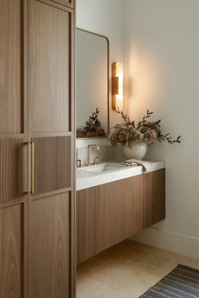 This bathroom vanity feels warm and simple. The wood tones and black handles look smooth and neat. The open shelf below is perfect for baskets that hold towels or skincare. A round mirror and soft light make it calm and modern. The earthy shades match 2025’s cozy style. I’d add terracotta pieces for a fresh, seasonal touch. It’s both pretty and handy. Want this look? Use reclaimed wood or other planet-friendly materials. Share what you think in the comments!