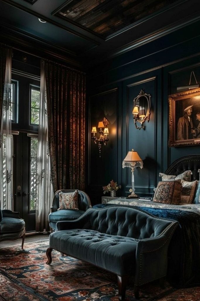 I once scored a velvet headboard at a flea market for peanuts, and let me tell you, it changed everything—suddenly, our bed felt like a hug. This blue-toned beauty echoes that: the tufted velvet in midnight navy against crisp white duvet screams sophisticated romance. Fluffy euro shams and a knit throw in soft gray invite snuggling, while the brass side lamps cast a golden pool of light perfect for late-night reads. That mirror leaning against the wall? Smart move—bounces light and makes the space feel bigger for two. Drawing from trends I’ve followed since design school, this cozy couple bedroom decor nails intimacy with clean lines. If blues feel too cool, warm it with a faux fur rug; it’s transformed chilly mornings for us every time.