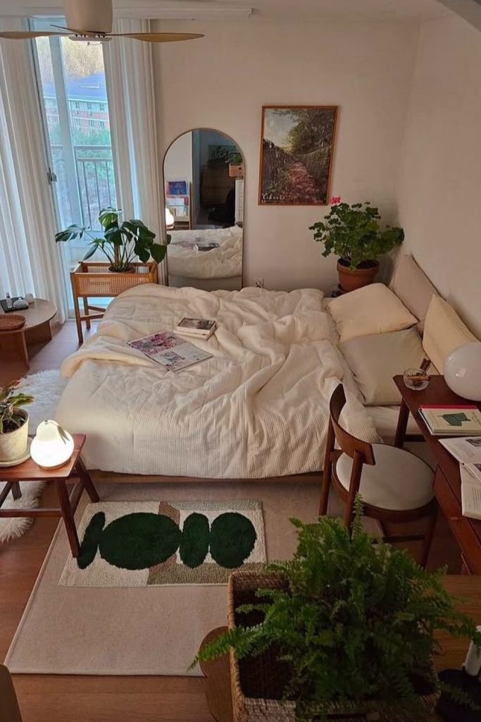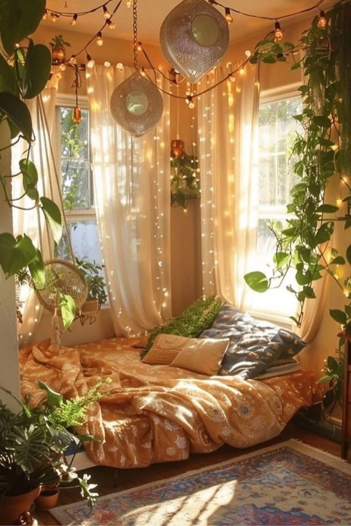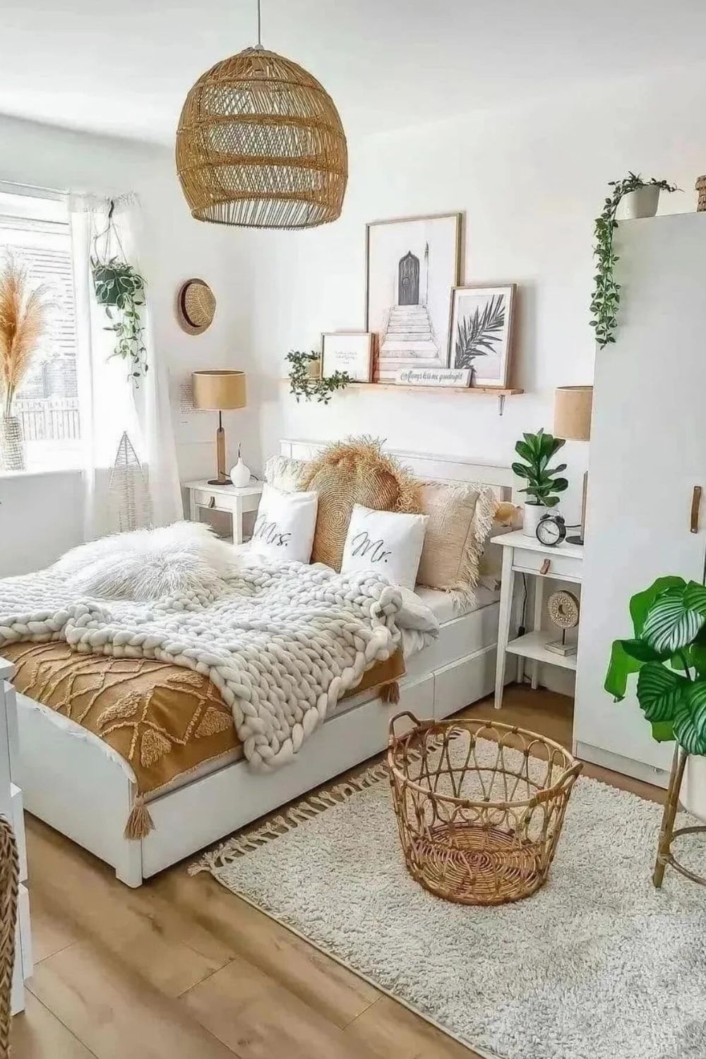 Back when my partner and I first moved in together, our room was a mess of mismatched stuff—until I layered in some boho magic like this. The macrame wall hanging above the bed adds that free-spirited touch, catching the light from the gauzy canopy draped overhead. Bedding in soft sages and creams feels fresh yet lived-in, with patterned pillows that mix prints without clashing. I adore the rattan tray on the bed for breakfast trays—practical romance! Those potted succulents on the sill bring in that sustainable vibe I’ve been obsessed with lately. For small bedroom decor for two, this setup shines by using vertical space wisely. My advice? Start with thrifted finds; they’ve saved our budget more times than I can count, turning chaos into a haven.