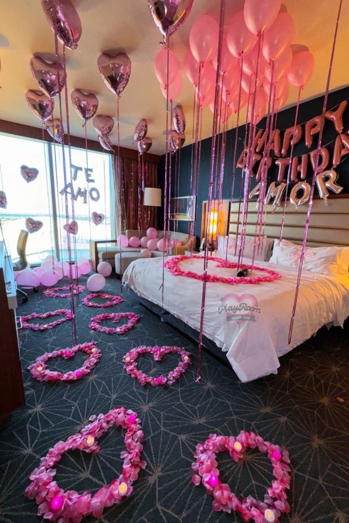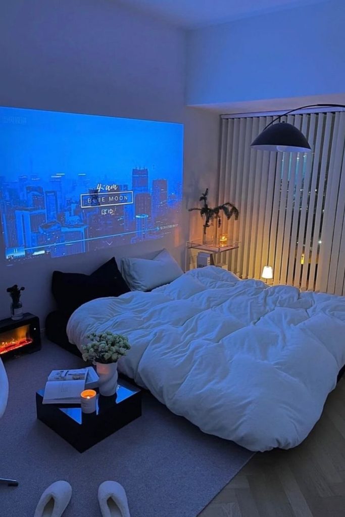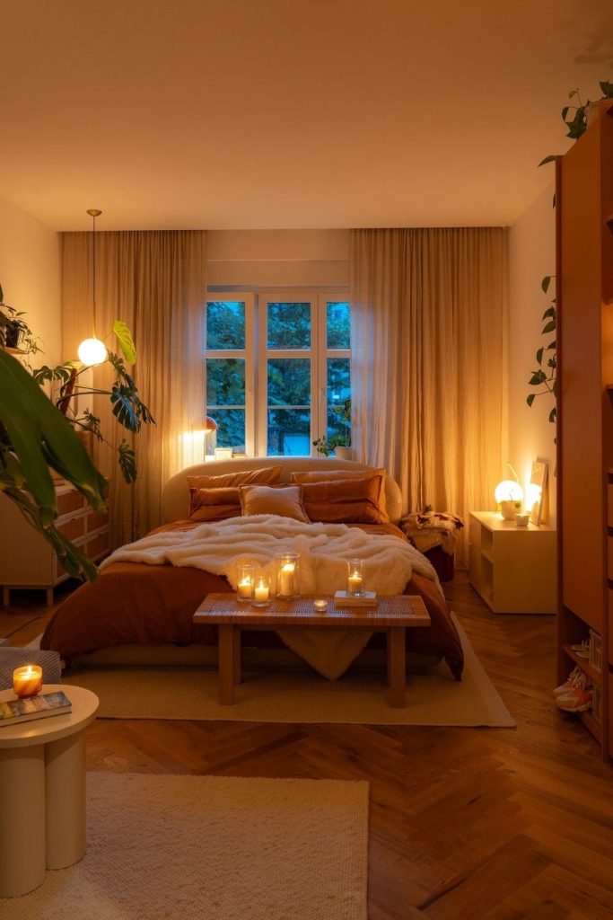 Nothing beats dimming the lights for a movie night in, right? I remember rigging up similar tealights along our windowsill after a rainy date—pure magic. Here, the bed’s swathed in charcoal sheets with blush accents, that pop of pink from the pillows softening the edges. A low wooden bench at the foot doubles as storage for blankets, keeping things tidy for spontaneous lounging. The candles clustered on floating shelves flicker just enough to set a mood without fire hazards—safety first, always my rule from years of hosting. This intimate lighting ideas for couples setup feels like a hug from the room itself. If you’re DIY-inclined, try battery-operated ones; they’ve kept our romance flickering through power outages.
