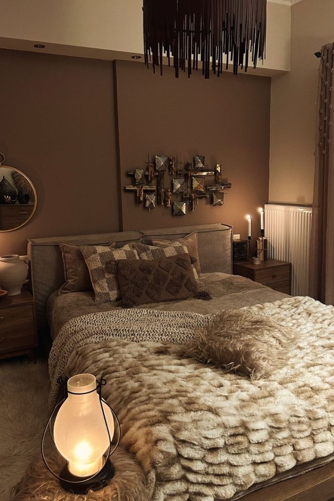 Wood tones always ground me—grew up with a cabin vibe, so this rustic charmer hits home. The reclaimed beam headboard pairs with a chunky knit blanket in oatmeal, all against crisp linens that rumple just right. Side tables in mismatched woods add character, topped with matte black lamps for that moody read-at-bedtime glow. A woven dreamcatcher dangles subtly, nodding to boho without overwhelming. From my blogger adventures, thrifted decor for shared spaces like this builds stories into your home. It’s affordable romantic bedroom makeovers done right—layer in sheepskin for winter cozies, and you’ve got year-round appeal that feels personal.