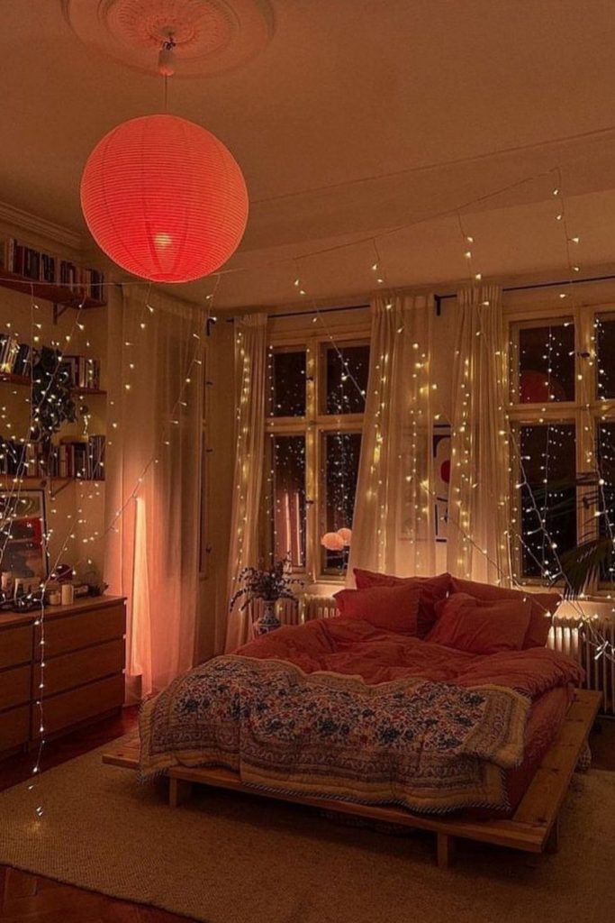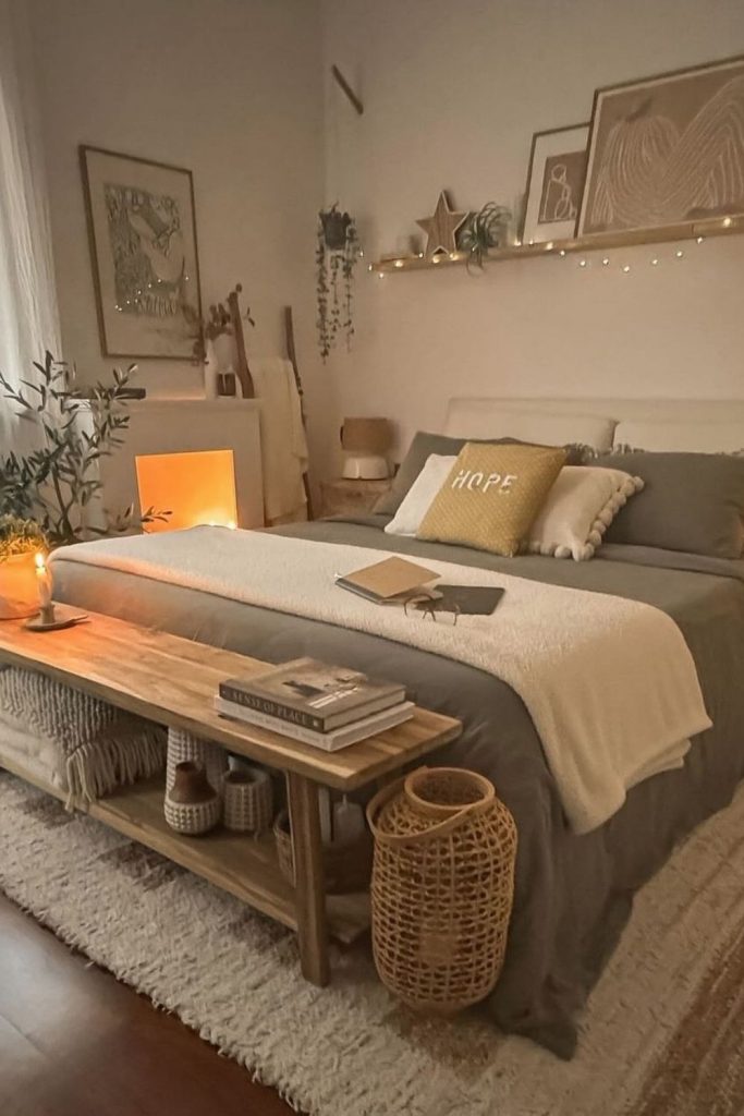 Fall always hits me with that urge to warm things up, you know? Last year, I swapped our cool grays for these burnt orange accents, and it was like the room sighed in relief. Here, the bed’s headboard in deep terracotta pairs so well with the ivory bedding—soft, rumpled sheets that beg for morning coffee in bed. Those woven baskets under the bed? Genius for hiding remotes or books, keeping the floor clear for barefoot dances. The string lights draped over the frame add that twinkly magic without overdoing it, and I spot a couple of framed quotes on the wall, probably sweet nothings you two wrote. It’s romantic bedroom ideas for couples at its coziest, blending seasonal palettes with everyday ease. Pro tip from my trial-and-error days: Layer rugs in jute for that boho edge—it muffles creaky floors and feels luxe underfoot.
