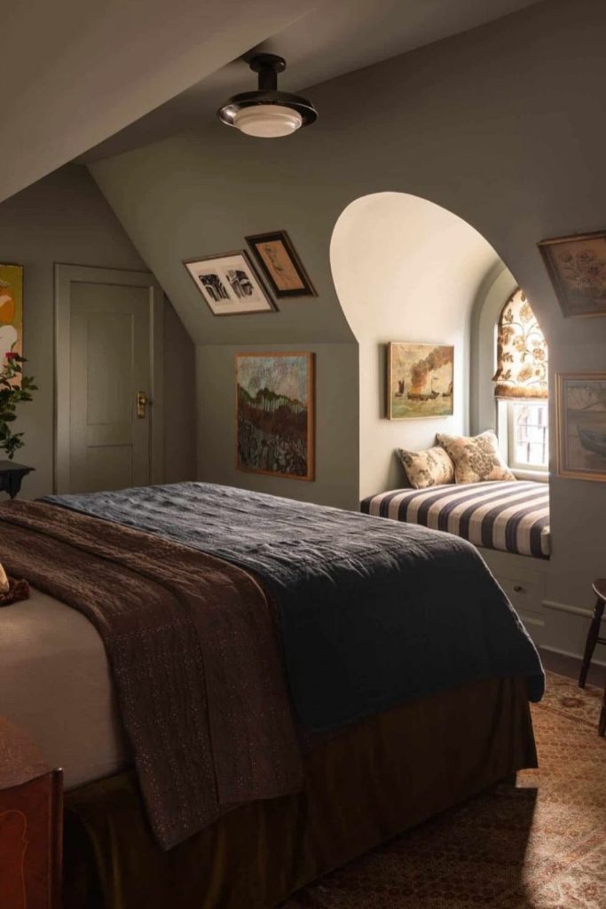 Grays get a bad rap, but moody ones? Obsessed—layered ours with textures for depth. This setup’s charcoal walls backdrop a velvet-upholstered bed in slate, silver linens shimmering under recessed lights. Faux fur throws add snuggly contrast, and a bar cart nearby for nightcaps screams date-night ready. Thrived decor for shared spaces builds in functionality like this. Expert nudge: Metallics reflect light, brightening without sacrificing sultriness. Your turn—gray fan or foe?