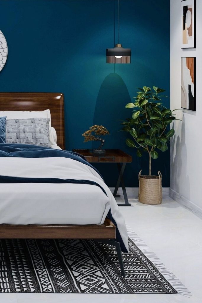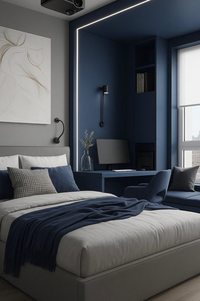 20. Modern Blue Bedroom with Bold Contrast
