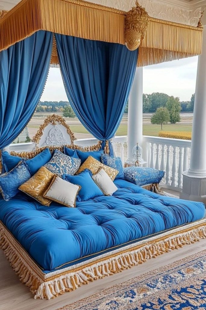 This bright blue bedroom feels so alive! The navy bed, fun pillows, and blue rug make it happy and warm. The wood headboard and green plants add a soft, natural touch. I love how the mix of fabrics makes it cozy and real. Want this look? Try bright blue prints with wood or plants for balance. It’s great for a warm, fun space. Feeling inspired? Save this idea and share your own decor tips below!