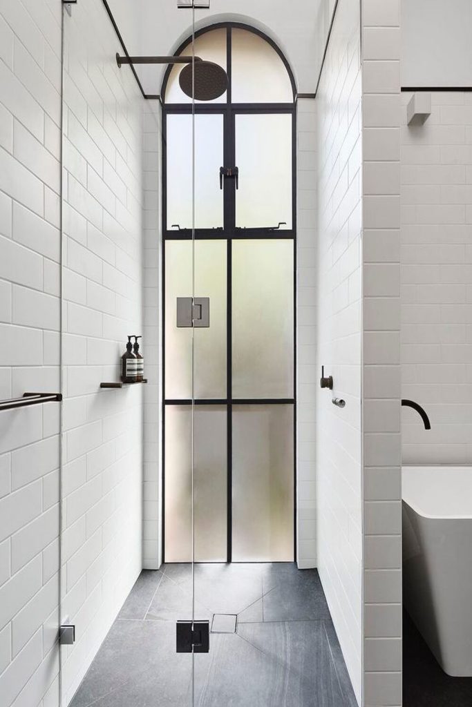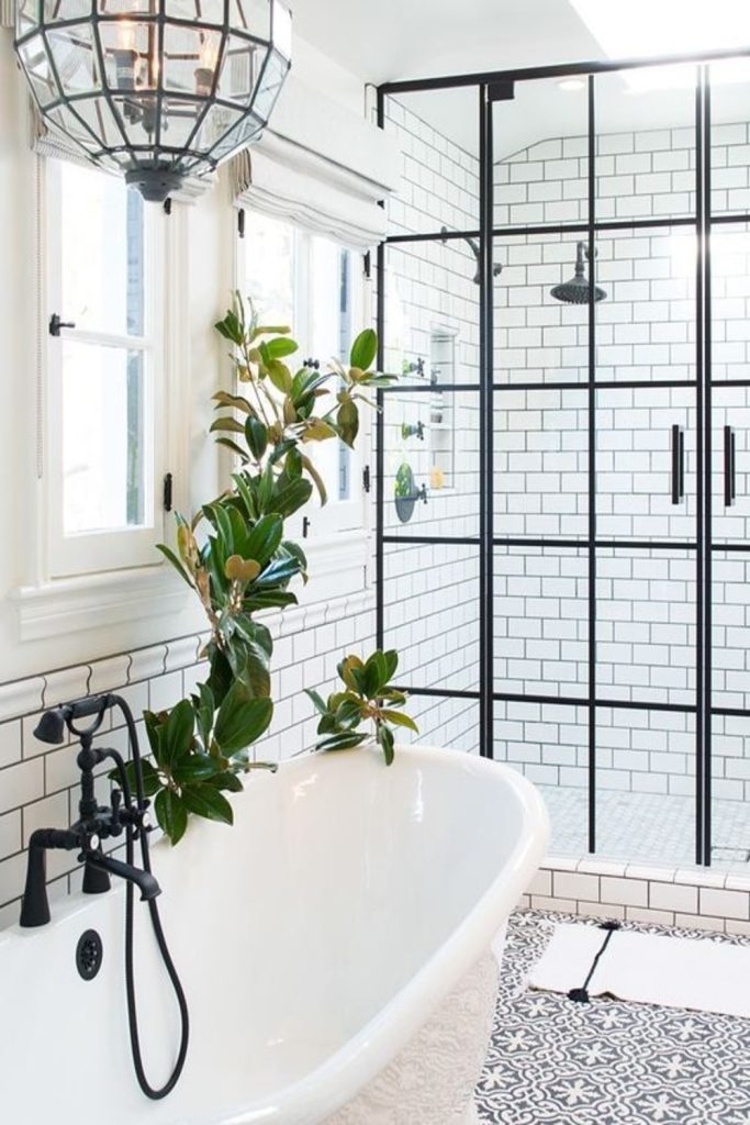 This look is for people who like clean lines. A black-framed shower door is a top trend. It looks like a frame for your tiles. It is an easy way to use black and white. Add green plants like a snake plant. You can also hang eucalyptus in the shower. The green looks great against the black and white. It feels high-end but does not cost a lot.