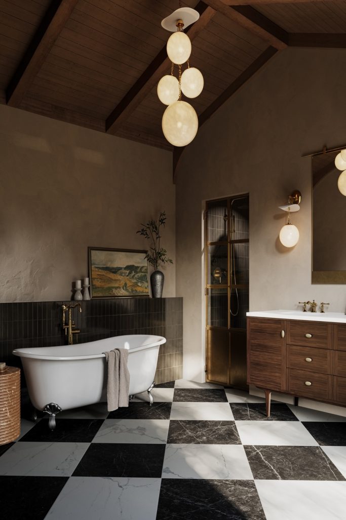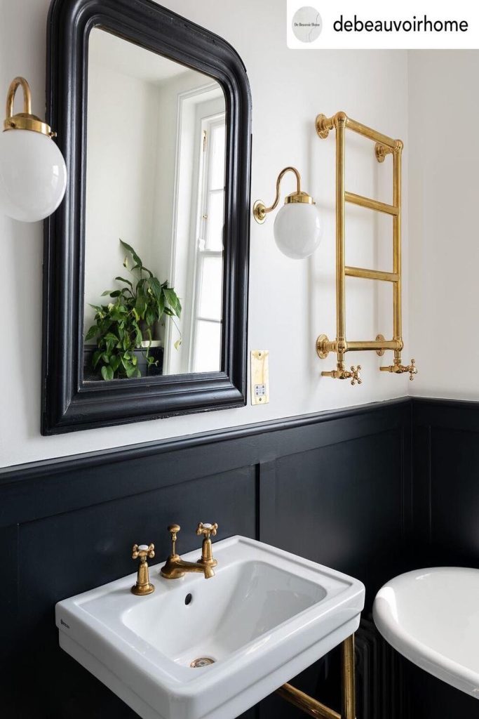 I love a clawfoot tub. Paint the outside black to make it pop. It turns a tub into a piece of art. This room mixes old and new styles. It uses vintage shapes and modern black taps. Focus on the small things. Use old-style lights and fancy mirrors. This “moody” style feels cozy. Black is not just for new homes. It works well in old homes too.