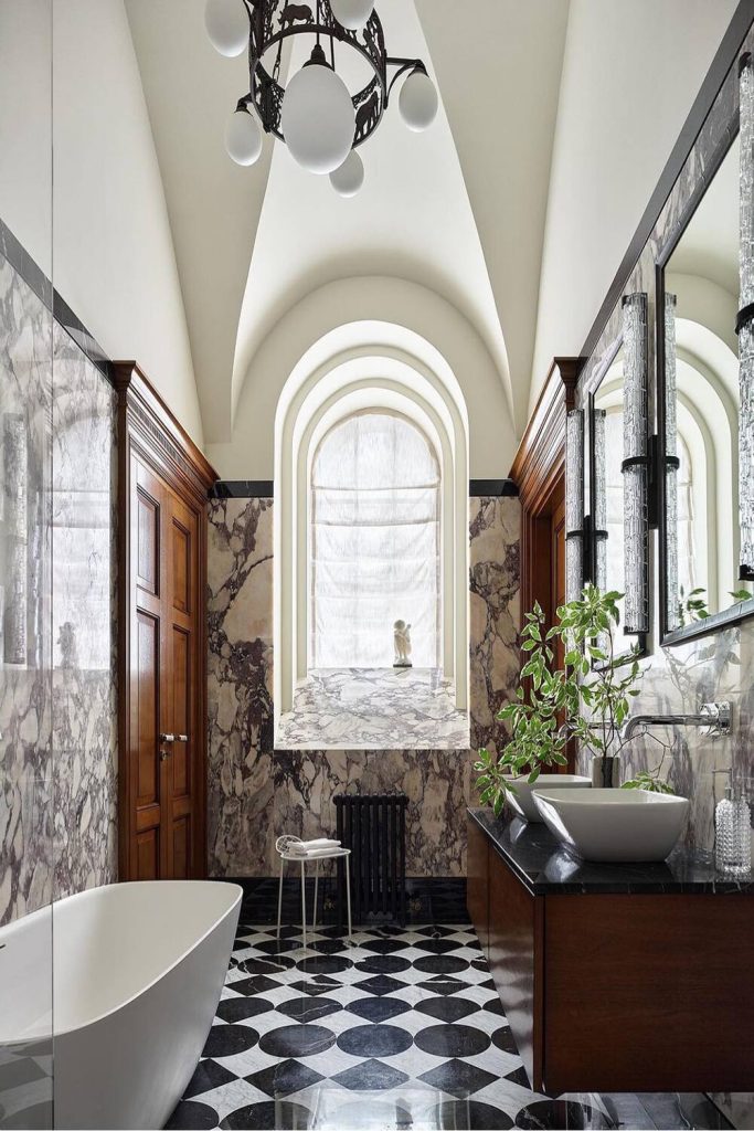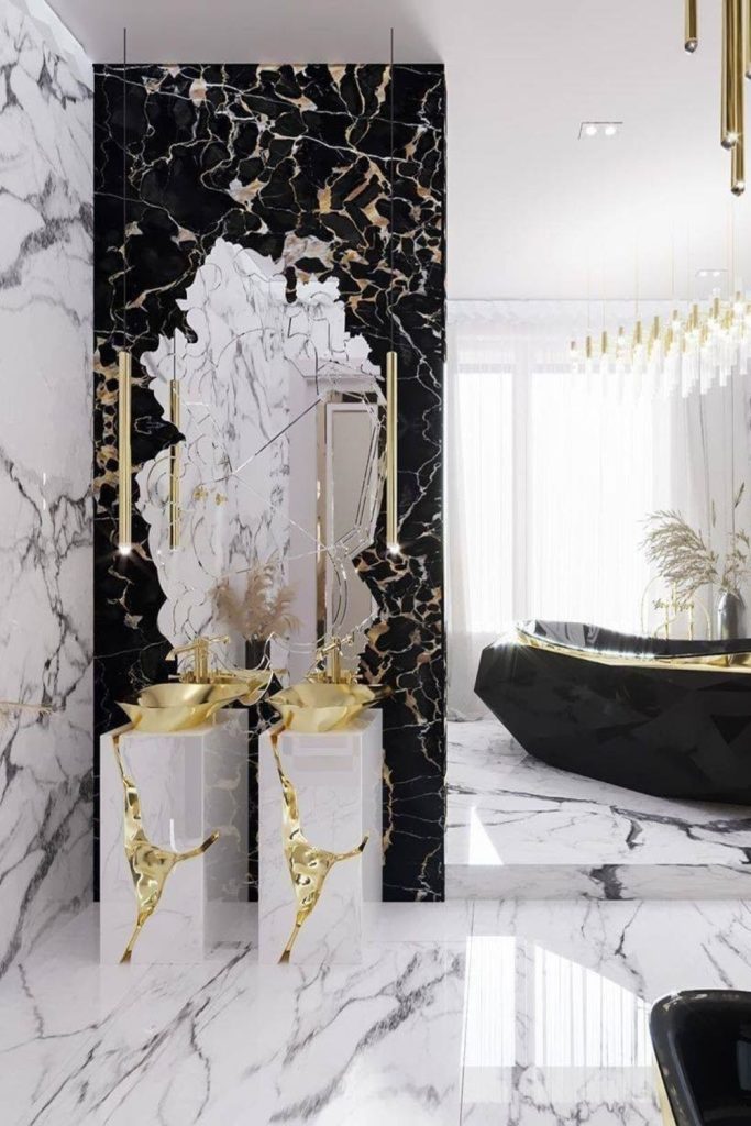 Marble is the ultimate luxury material, and when it features heavy black veining on a white background, it’s breathtaking. This bathroom uses stone as a focal point. You don’t need much else when your walls look like a piece of abstract art. To keep the focus on the stone, the fixtures are minimal. This look is all about “quiet luxury”—investing in high-quality materials that speak for themselves. It’s an aspirational look that never fails to impress.