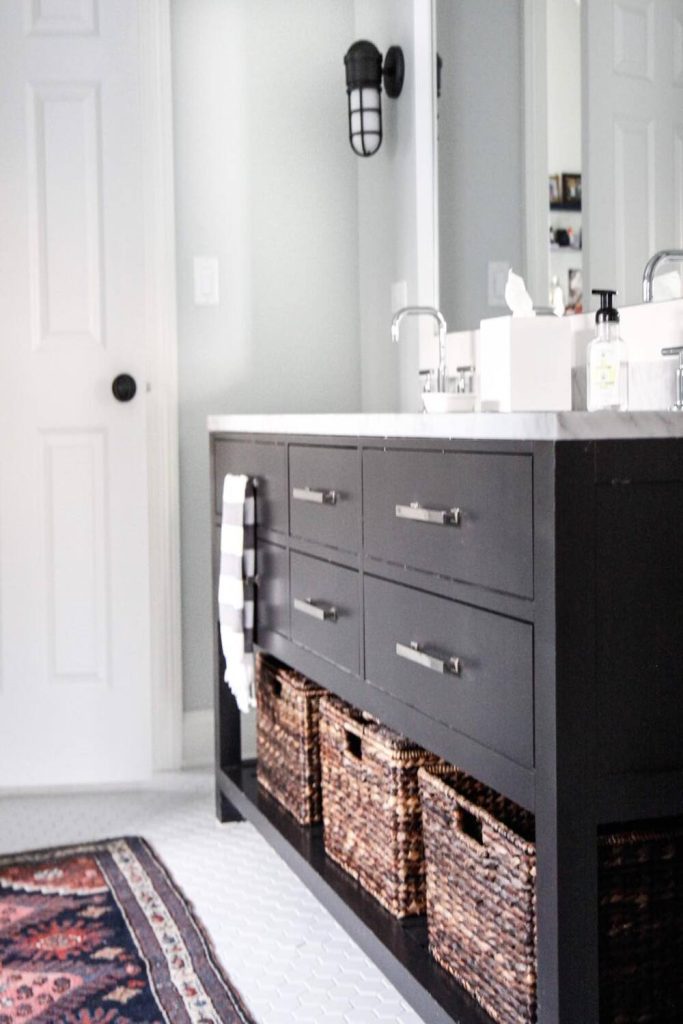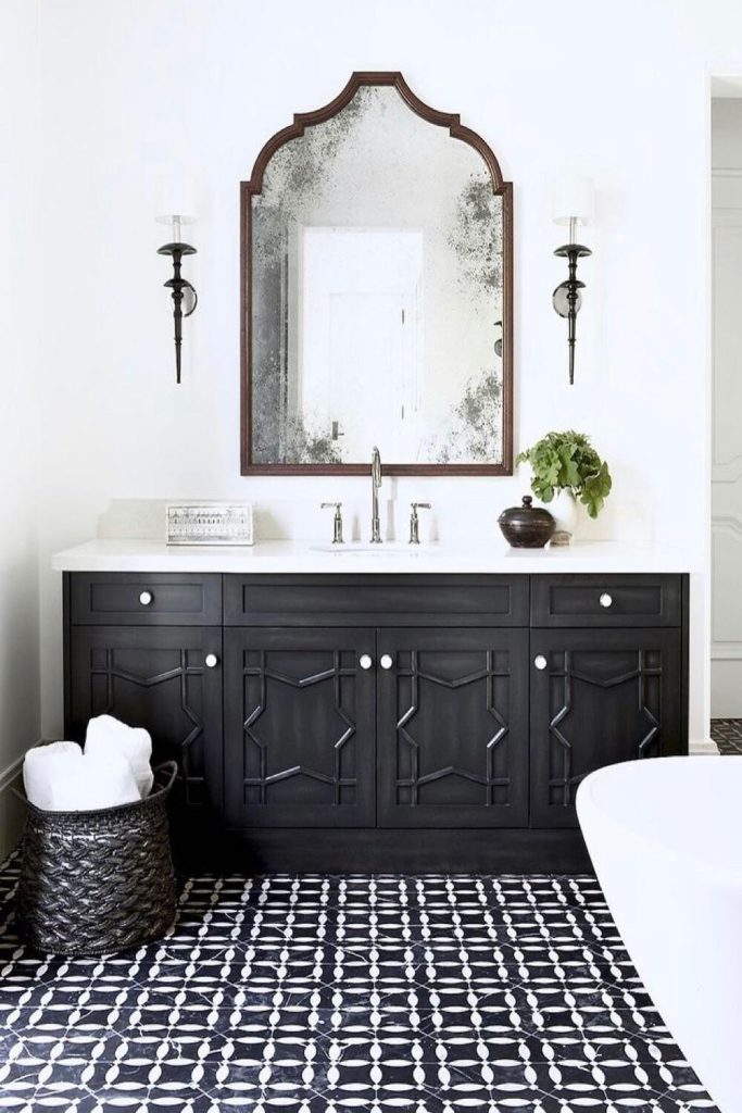 A black vanity looks great against a white wall. This makes a “modern farmhouse” style. It does not feel old. Matte black handles are a big deal. They make the room look rich. If you try this, add wood. A wood stool keeps the room from feeling cold. It is all about balance. High contrast makes the room look sharp.