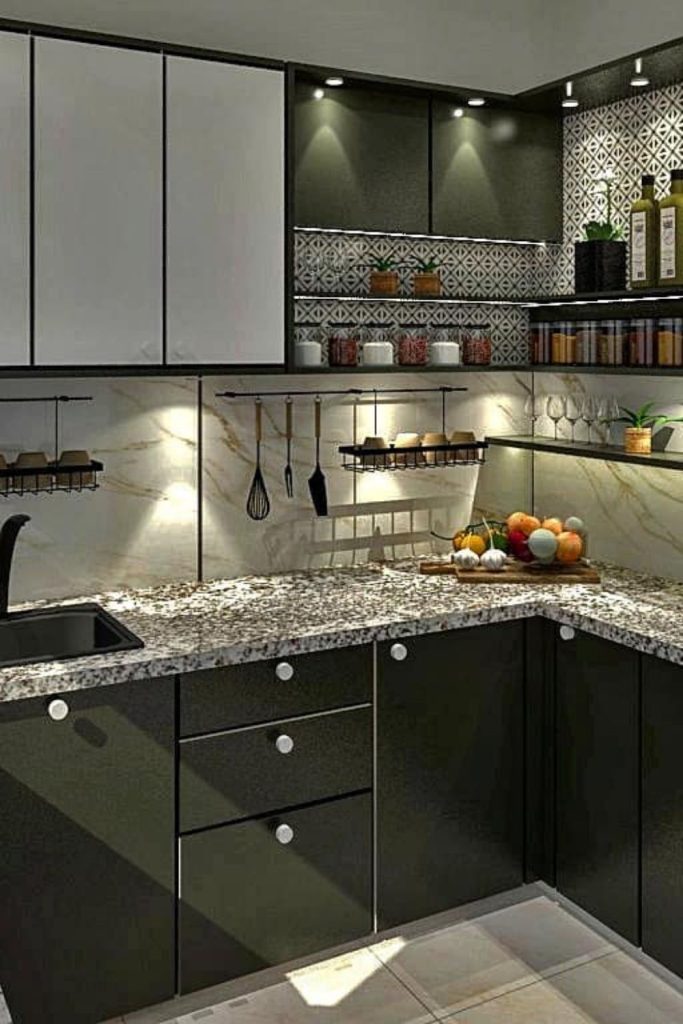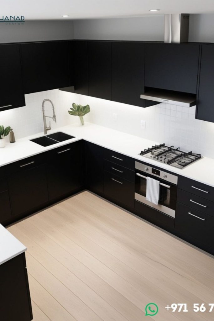 This kitchen is the epitome of sleek sophistication. Black cabinetry contrasts with white walls, creating a timeless monochrome look. The marble backsplash adds luxury, while wooden accents bring warmth, aligning with sustainable trends. I’m drawn to the minimalist fixtures—they keep the space clean and airy. It’s a design that works for any home. Want to recreate this? Pin this for ideas and let me know in the comments how you’d personalize this chic kitchen!