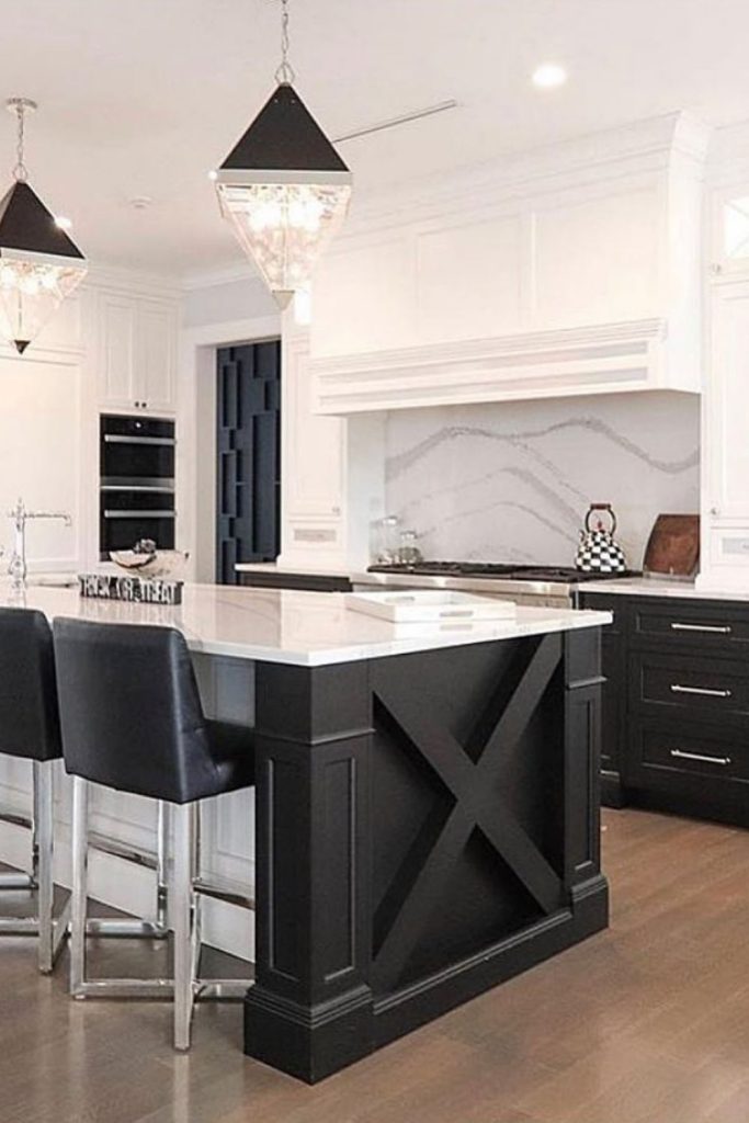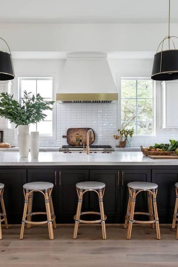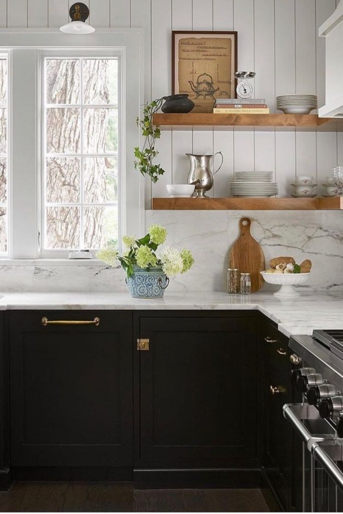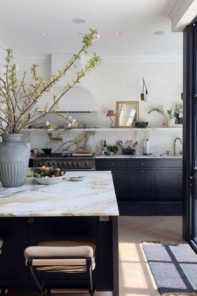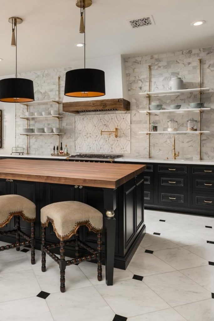 This kitchen is a timeless beauty, with white cabinetry and black accents creating a classic monochrome look. The marble island adds sophistication, while wooden elements bring warmth, aligning with sustainable design. I love the open shelving—it’s perfect for displaying personal touches. This space feels both elegant and homey. Want to recreate this? Pin this for inspiration and share your favorite way to add elegance to a kitchen in the comments!