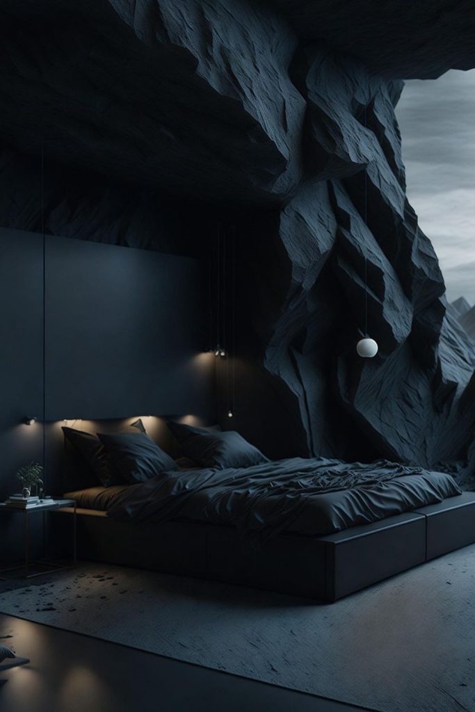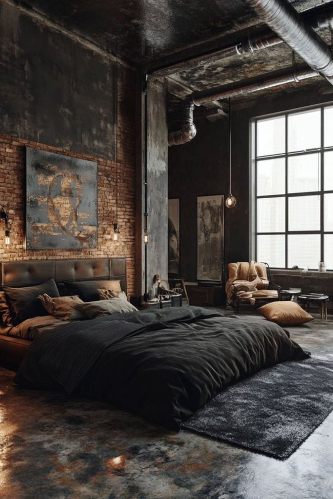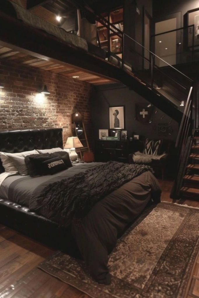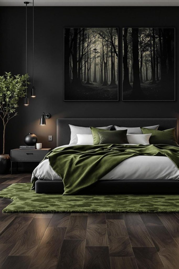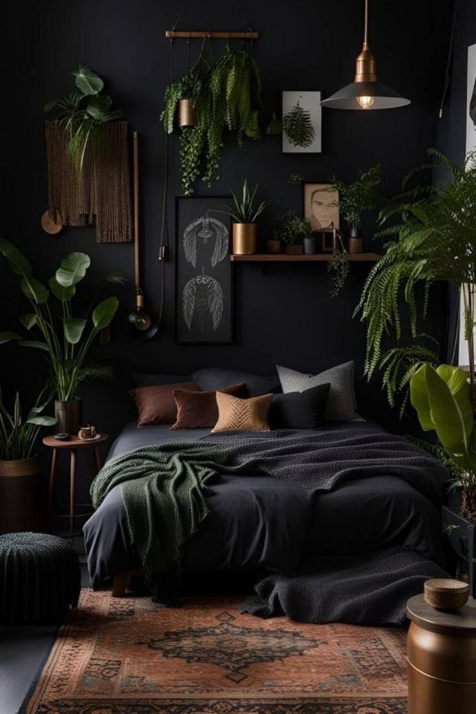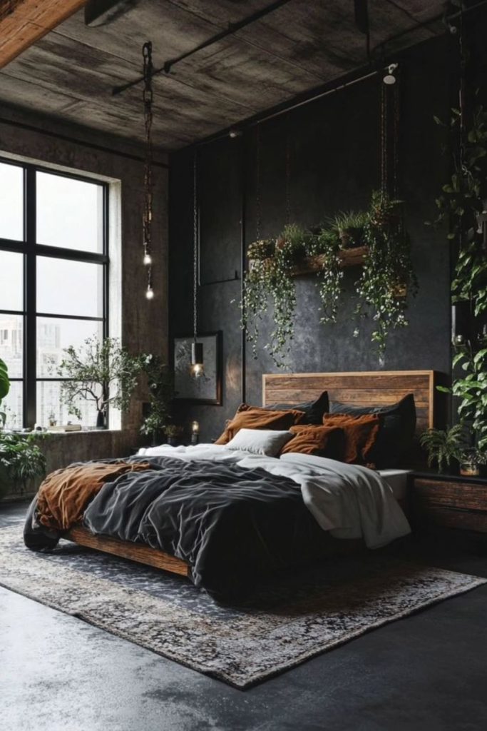 This black bedroom feels like a cozy cabin. Matte black walls meet a wooden bed. Plaid sheets in earthy colors feel warm. A small lantern lamp adds charm. A woven rug adds texture. It mixes bold and rustic. Perfect for a woman who loves cozy style. Tip: Use rustic elements with dark tones. Pin this and share your favorite rustic idea!
