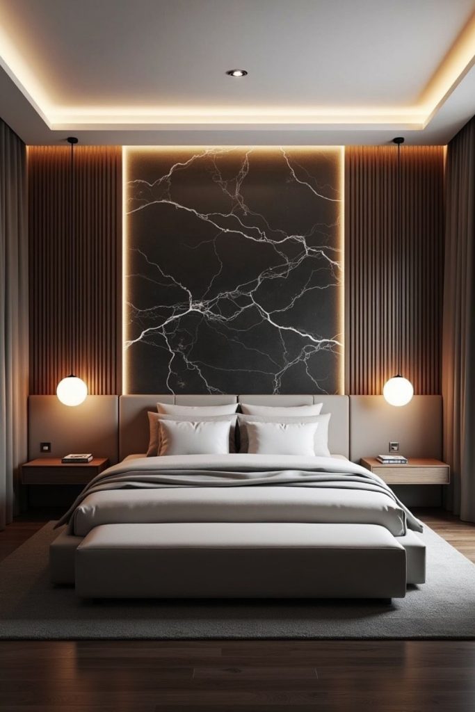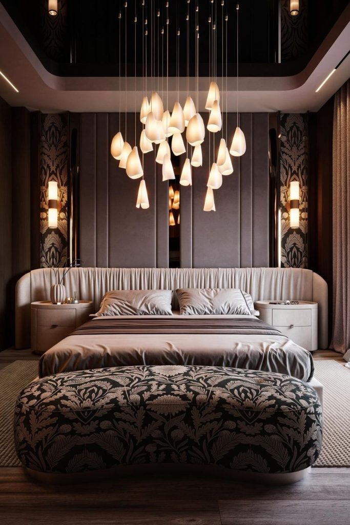 This bedroom is pure elegance. Matte black walls are bold. A big chandelier adds glamour. Soft gray bedding and a woven throw keep it cozy. A jute rug adds texture. A gold mirror reflects light and makes the room airy. Focus on one standout piece to lift the room. Pin this style and share your lighting tips!