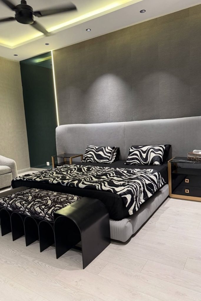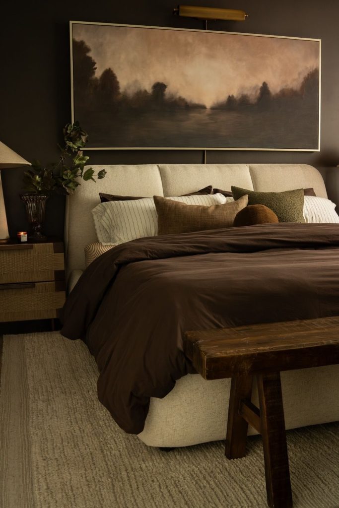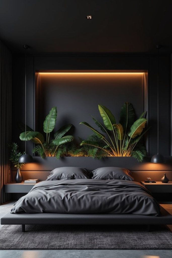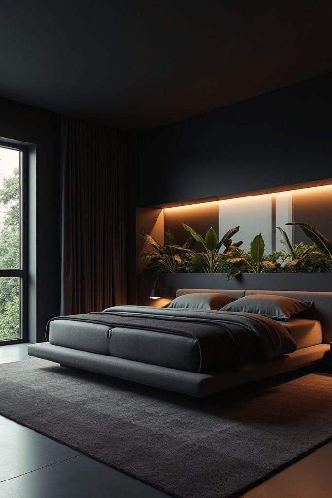 This room shows simple elegance. Charcoal bedding and a chunky knit throw feel inviting. The sleek black headboard is simple but striking. One potted plant adds nature and keeps it green. A cream rug makes it cozy and neat. You do not need much to make a statement. Layer textures to keep it modern and warm. Share your favorite tips!